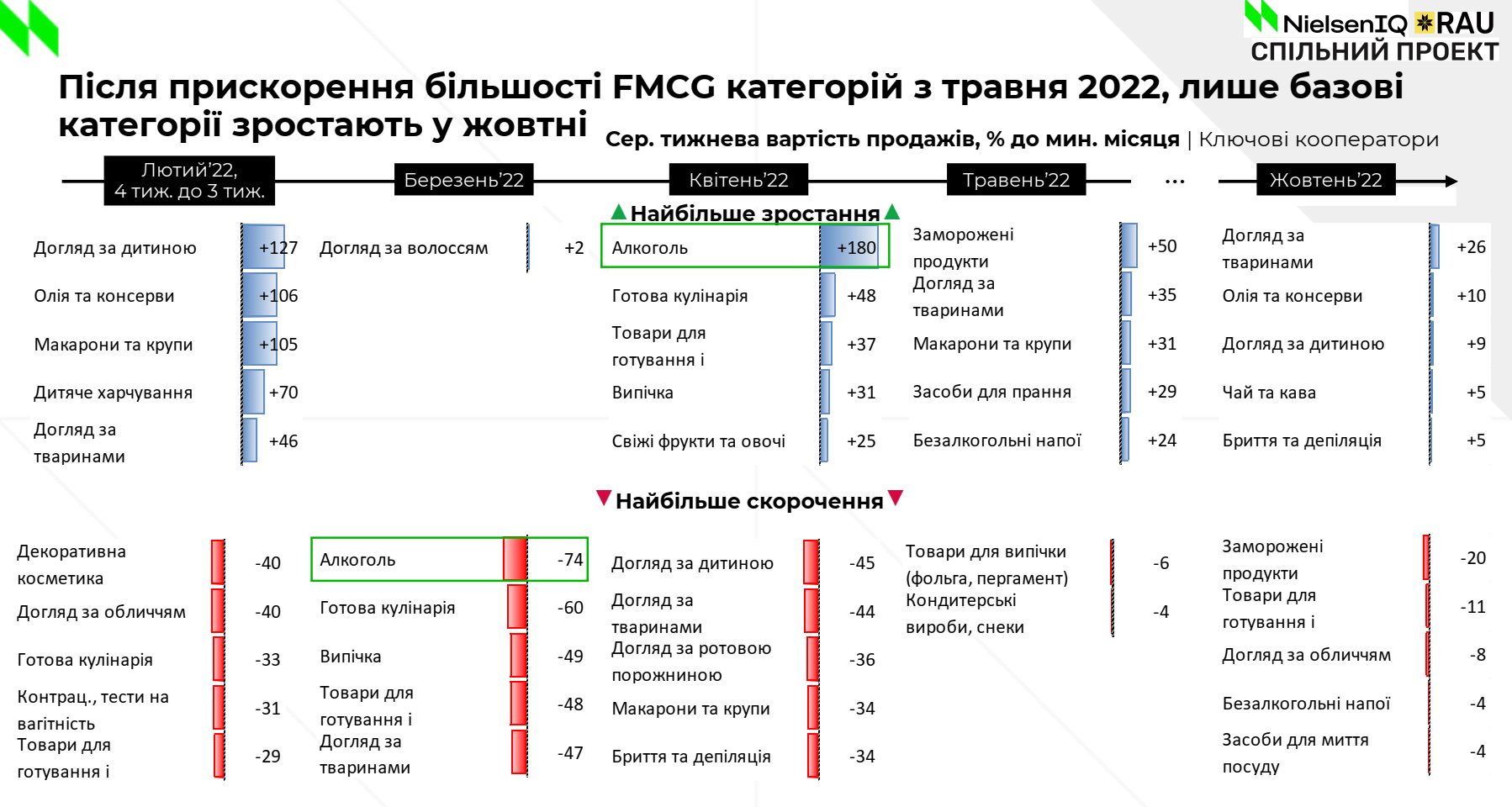 Варті уваги й зміни серед лідерів продажів у різний час. Так, на початку війни люди робили запаси засобів догляду за дитиною, круп, консервів, олії та інших товарів тривалого зберігання. Потім стався провал торгівлі у березні та невелике зростання показав лише сегмент товарів по догляду за волоссям, а продажі алкоголю обвалилися на 74% через введення «сухого закону». Хто хотів, все одно міг придбати алкогольні напої, але не через організований рітейл, який лише недоотримав значні кошти від такої заборони. Зайвим підтвердженням чому стало збільшення продажів майже втричі (+180%) після часткового зняття у квітні обмежень на торгівлю алкогольними напоями. Після цього дана категорія ніколи не потрапляла в топи продажів, ба більше: згодом вона знову показала падіння. Це гарний приклад зайвого державного регулювання. Починаючи з травня, попитом знову користувалися лише базові споживчі товари (місяць до місяця).