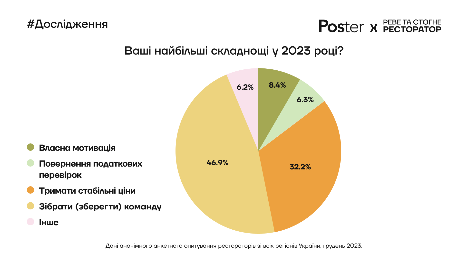 Найскладніше рестораторам у 2023 році було наймати та утримувати команди, тримати ціни на страви попри зростання цін, знаходити власну мотивацію для роботи та розбиратися з перевірками. Окрім цього, підприємців турбувала повна зміна ЦА, комунальні платежі та корупція, низькі продажі та зміна поведінки покупців.