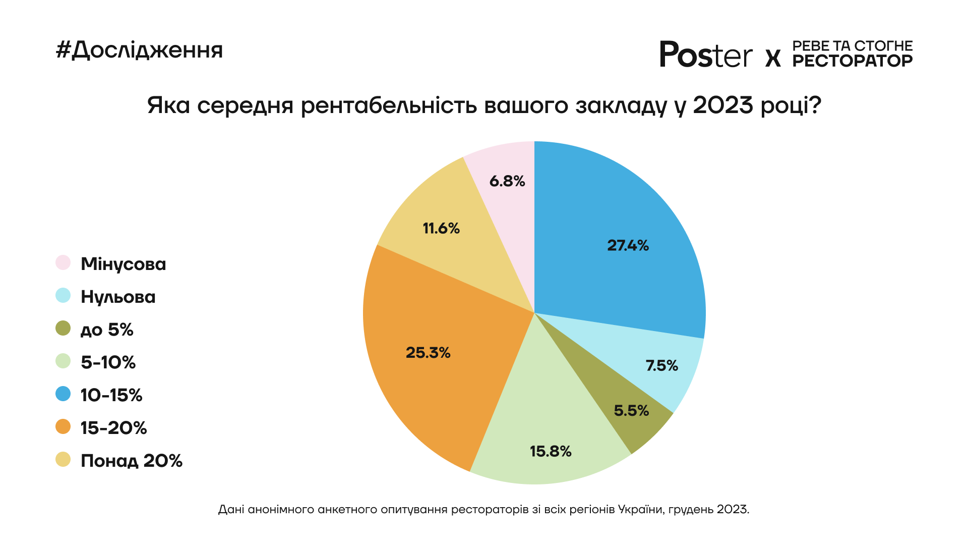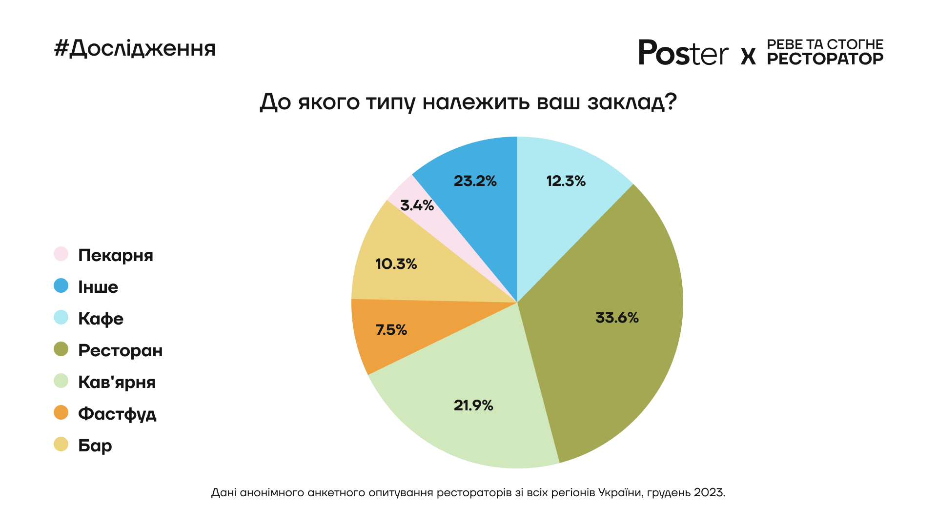 Дані, приведені в цьому розділі, ґрунтуються на анонімному анкетному опитуванні рестораторів зі всієї України. Опитування проведене в Telegram-медіа «Реве та стогне ресторатор» у грудні 2023 року.