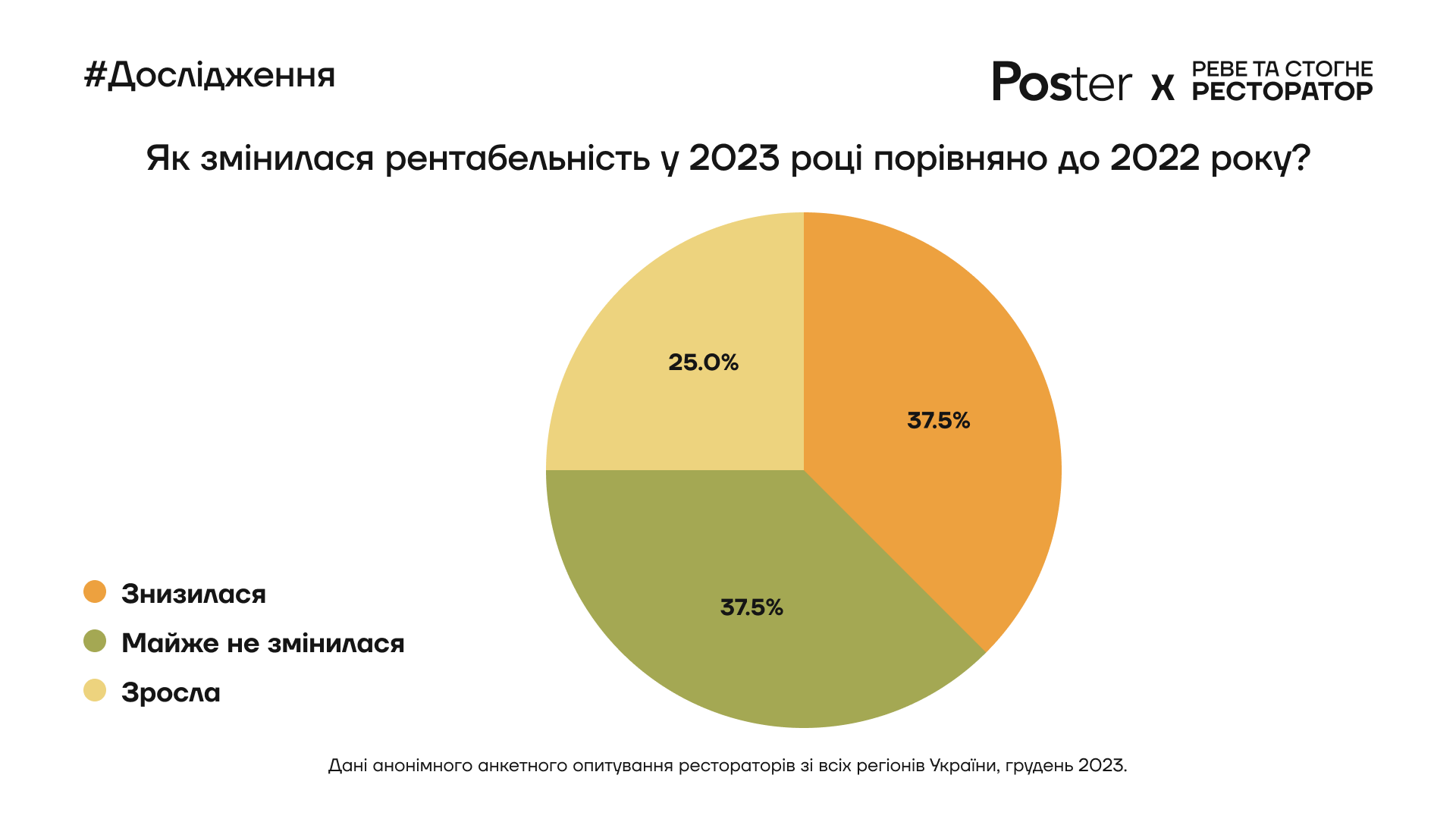 38% рестораторів вимушені були стикнутися зі зниженням рентабельності бізнесу у 2023 році. Майже така ж кількість зазначає, що рентабельність їх закладів не змінилася. Чверть опитаних каже про зростання рентабельності.