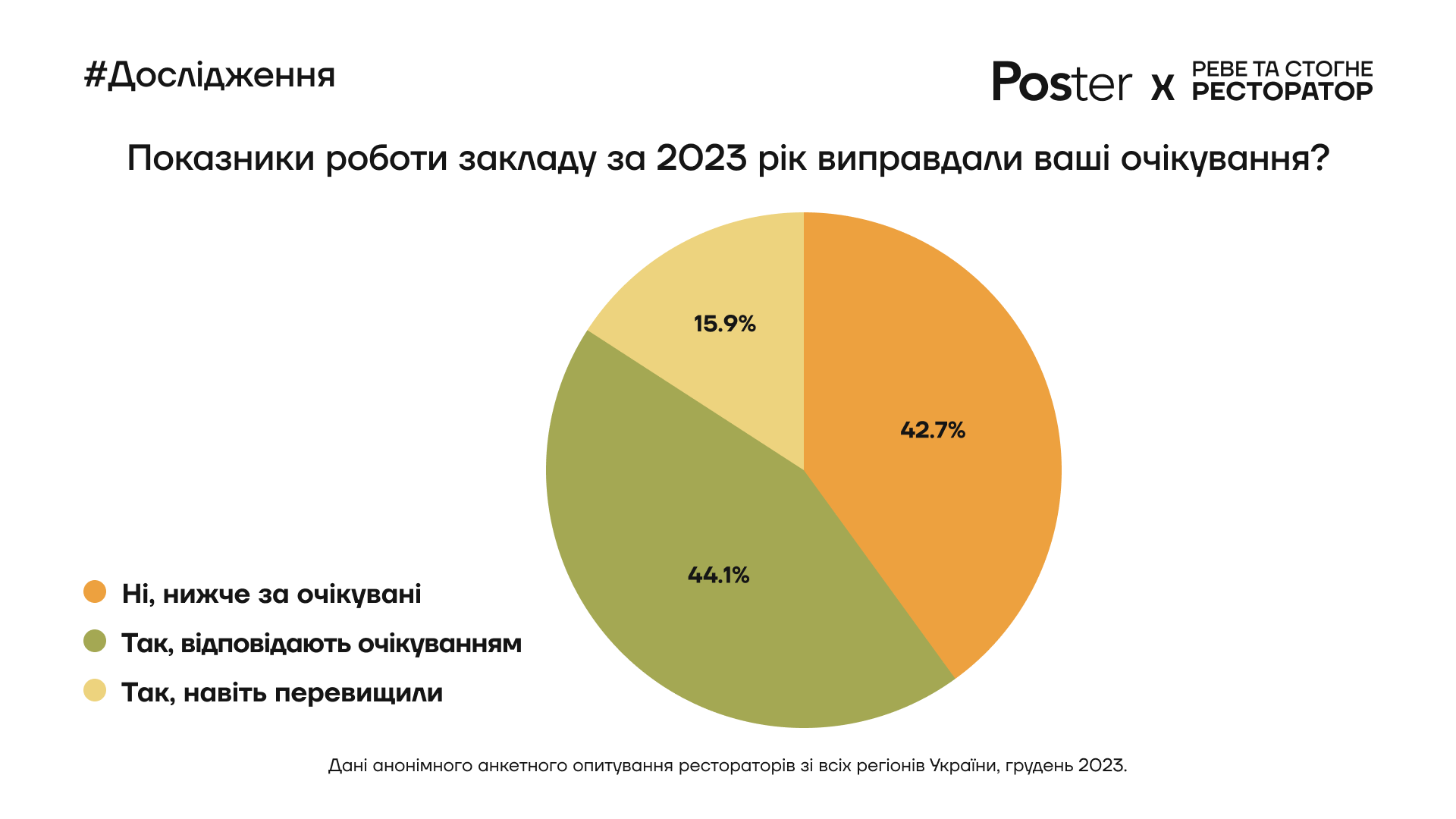 44% опитаних рестораторів зазначають, що показники роботи закладів у 2023 році виправдали їх очікування. Водночас 40% мають протилежну думку. У 16 % показники навіть перевищили очікування.