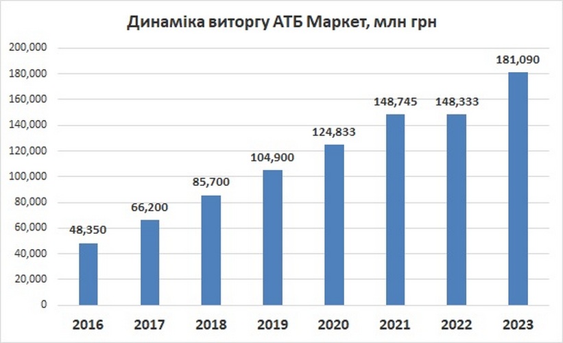 Згідно з даними системи Youcontrol, виторг мережі АТБ Маркет за 2023 рік становив 181 млрд грн, що на 22% перевищує показник 2022 року.