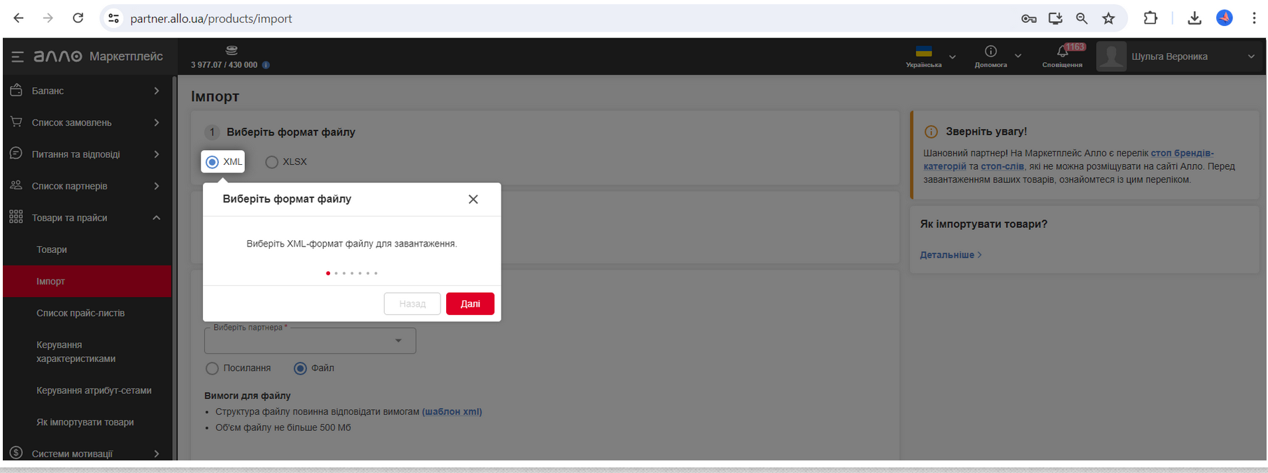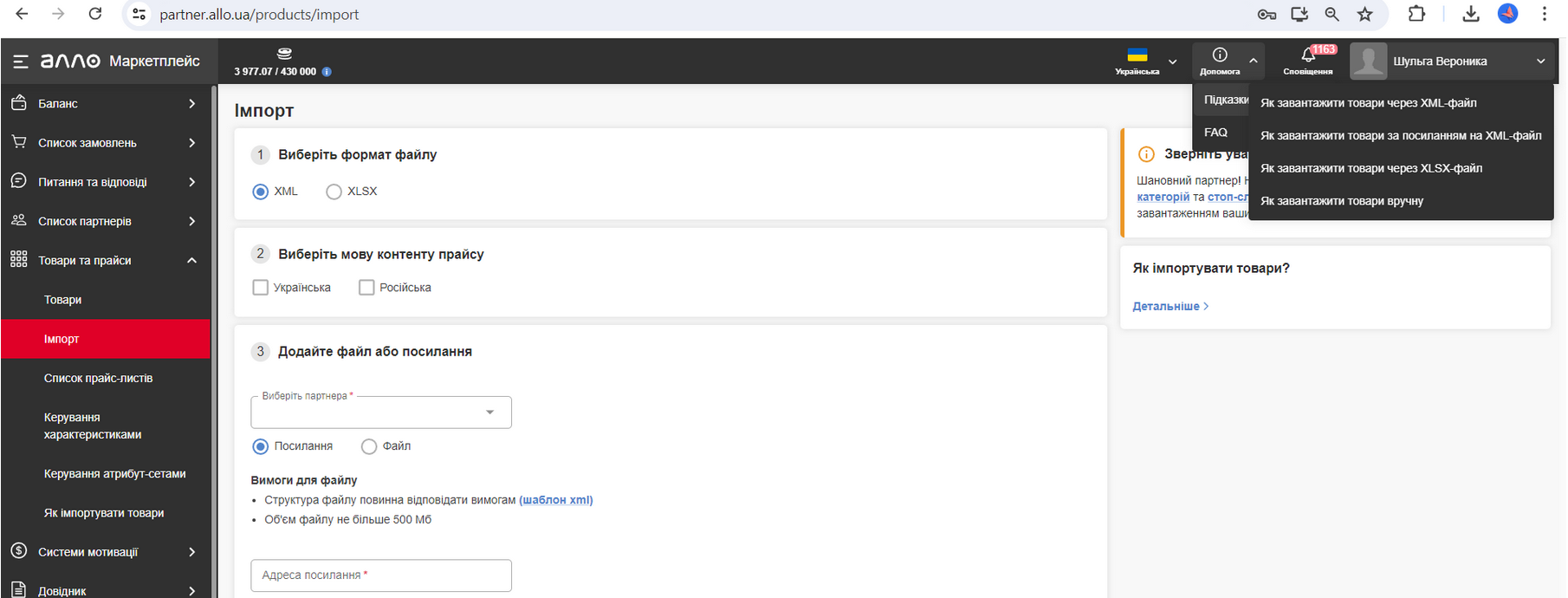 - Підказки в кабінеті мерчанта, які стосуються імпорту карток товарів в розділі Товари та прайси. Мерчанти бачитимуть чіткі підказки щодо своїх подальших дій: який формат файлу завантажити, де додати посилання тощо. Хоча робота в кабінеті мерчанта інтуїтивно зрозуміла та проста, підказки допоможуть зорієнтуватися новим партнерам.
