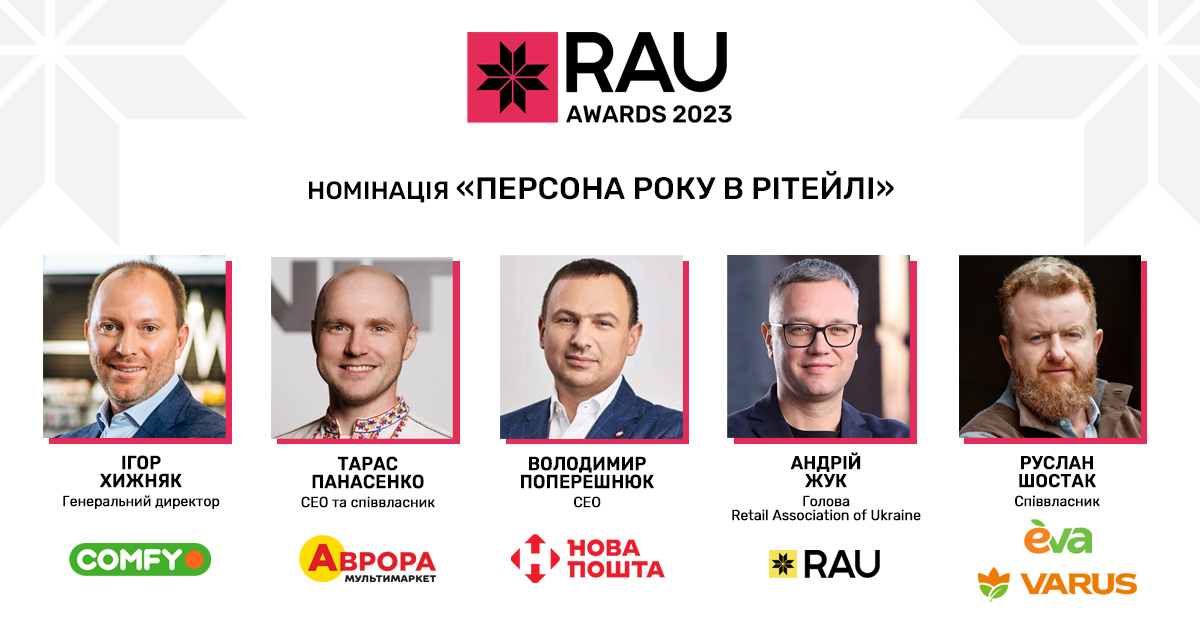 В ході VI щорічного конкурсу RAU Awards будуть нагороджені кращі компанії сфери рітейлу та кращі ТРЦ. Окремо буду нагороджені люди, які найбільше зробили для розвитку сфер рітейлу та девелопменту торговельної нерухомості в 2022/23 роках. Short-list номінантів – 5 претендентів на премію «Персона року в рітейлі» і 5 – на премію «Персона року в девелопменті» – складався за підсумками голосування Експертної ради конкурсу.