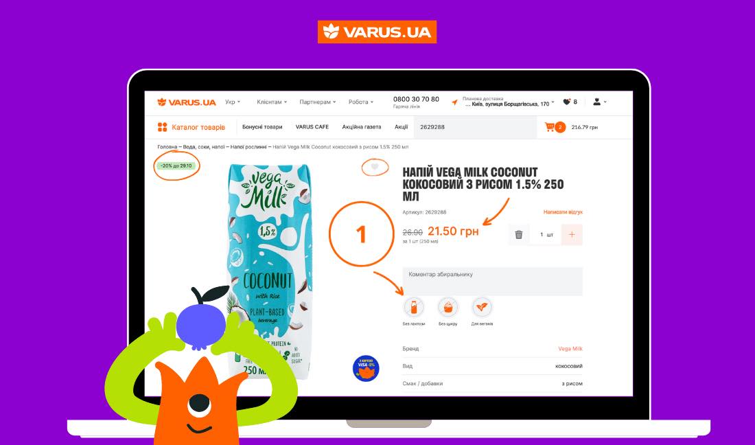 Якщо обраного товару не стало в наявності — не страшно, сервіс varus.ua на етапі кошика пропонує замінити його на альтернативний. Крім того, клієнт отримує нагадування про товари, які відповідають його інтересам, але відсутні в даному замовленні. Шанс забути щось важливе — мінімальний.