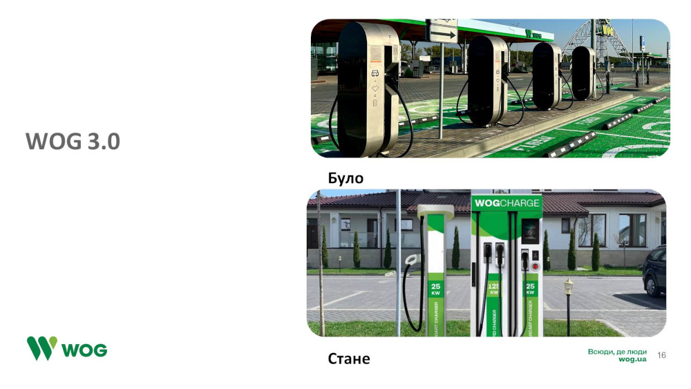 Є електрозарядна станція на 14 автомобілів. І незабаром виходимо зі своїм власним проєктом – WOG Charge.