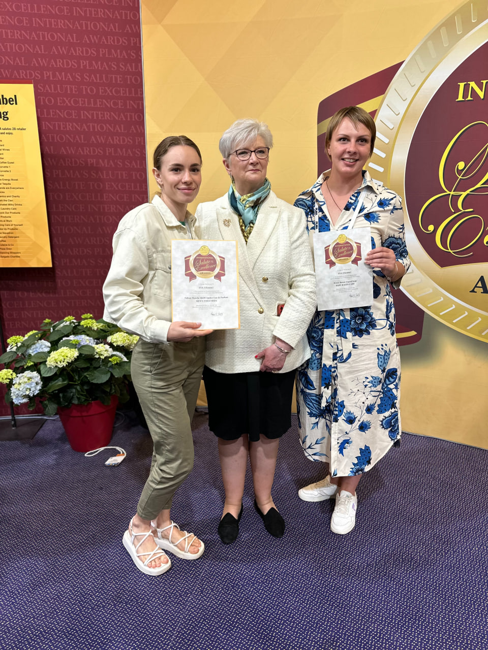 На міжнародній виставці-конкурсі Private Label Manufactures Association 2024 International Salute to Excellence Awards нагороди отримали одразу 2 продукти від Eva. В категорії Baby & Kids Care (Засоби для догляду за дітьми) перемогло рідке мило Honey Bunny Liquid Soap, яке відзначили не лише за якість, але й за грайливий цікавий дизайн. До команди, що створила продукт входять бренд-менеджерка Олена Марковська, керівниця напряму Валерія Марфут, директорка департаменту Галина Ободець.