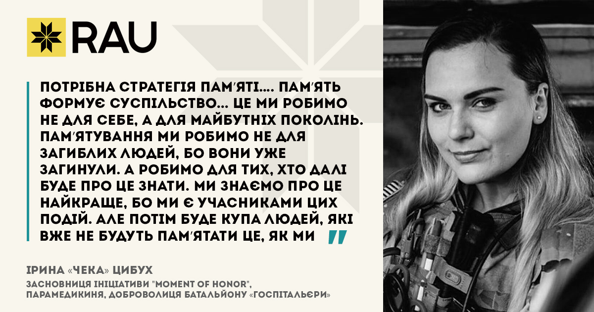 “Пам’ять формує суспільство. Це ми робимо не для себе, а для майбутніх поколінь…” – так говорила парамедикиня, доброволиця батальйону «Госпітальєри» Ірина “Чека” Цибух. Іра загинула, але її ініціатива щодо впровадження хвилини мовчання живе.