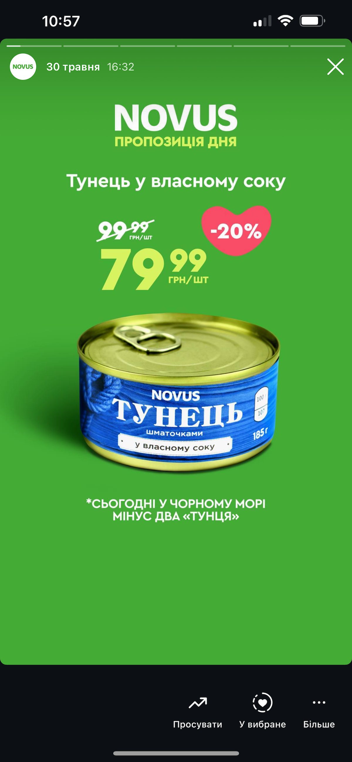 - Цінники та акційні пропозиції. Ми не перетворюємо соцмережі в електронну газетку з акціями, але обов’язково розповідаємо підписникам про вигідні пропозиції та актуальні знижки. Наприклад, у Novus є постійна рубрика – «Тижневі знижки». На візуалах обов’язково додаємо цінними, відсоток знижки та термін дії пропозиції. Вони мають займати 10-25% зображення. Для того, щоб це зробити органічно, ми розміщаємо умови у серцях. Річ у тім, що слоган Novus – Робимо, бо любимо. Основний візуальний елемент – серце. Тому тут і користь, і візуально залишаємося у межах загального концепту.