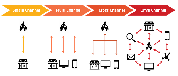 Від настольного комп’ютера до мобільного телефону, онлайн і офлайн: і створює безшовний досвід взаємодії клієнта з рітейлером. У наші дні ця концепція досить поширена, проте, за внутрішніми даними Criteo, лише 27% компаній мають повноцінну digital-стратегію, яку можна назвати омніканальною. Поширена плутанина між поняттями мультиканальності, омніканальності або навіть крос-девайса. Схематично різницю можна представити ось так: