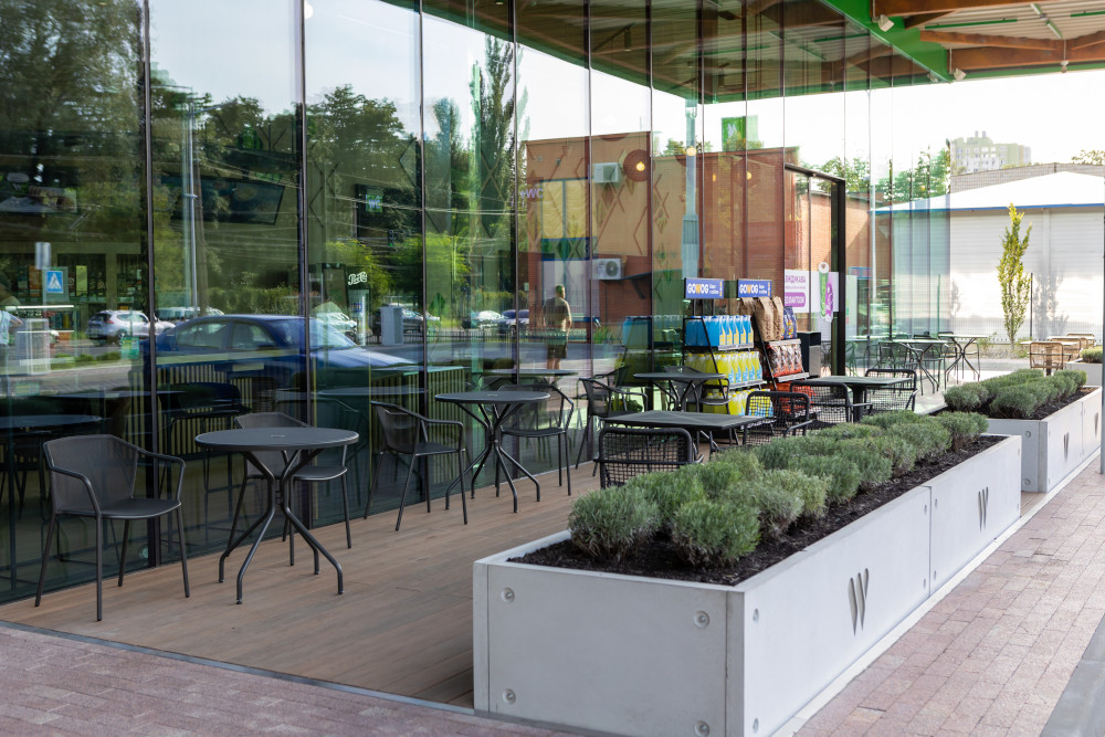 У теплу пору року відвідувачі можуть відпочивати на вулиці на зручній терасі, яка має 18 посадкових місць. А оздоблення живими рослинами створює додатковий затишок і комфорт.