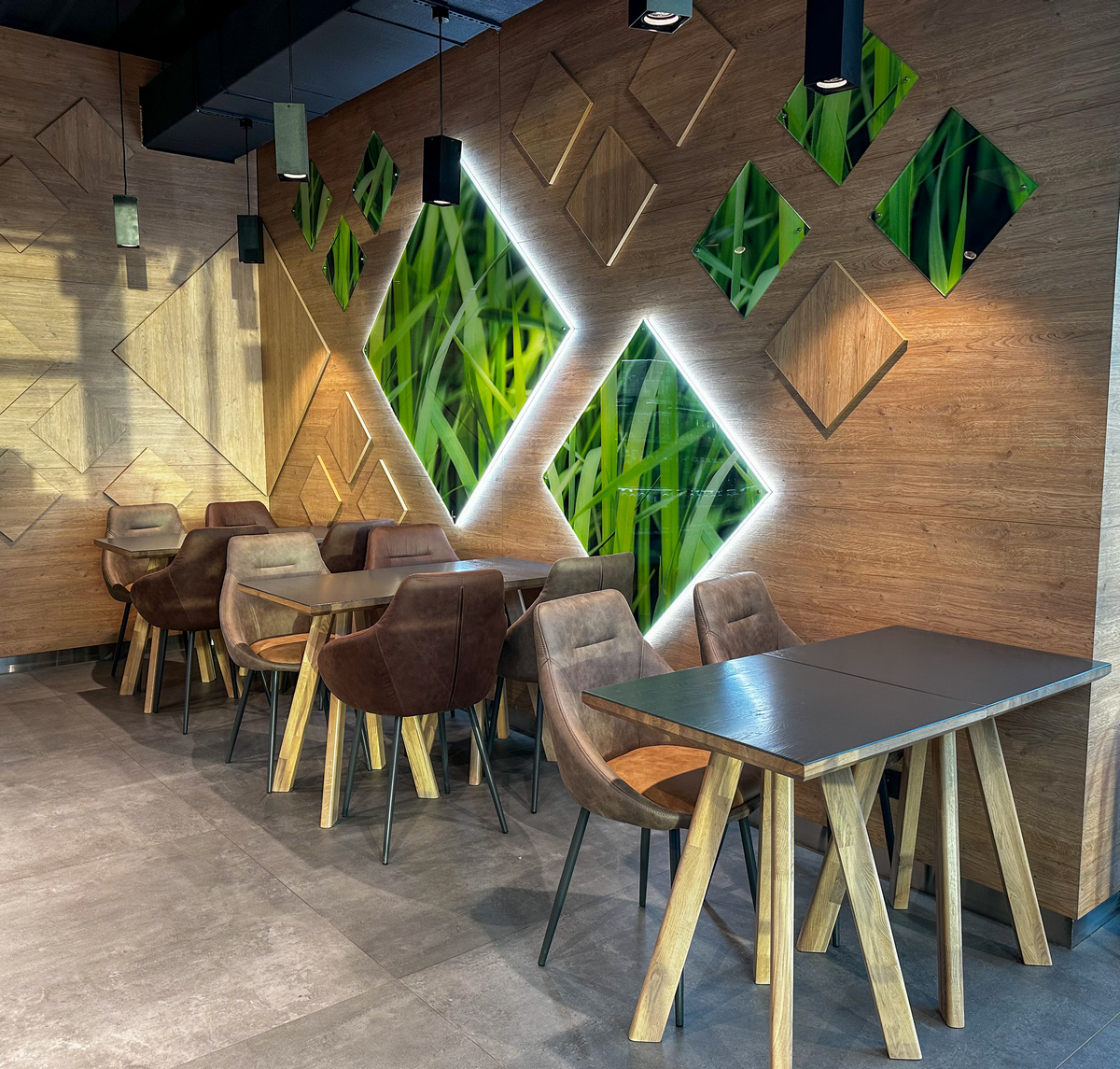 Щоб дати можливість гостям почуватися більш комфортно під час перебування на АЗК, в оздобленні інтер’єру використали натуральні матеріали з вкрапленнями елементів у фірмових зелених кольорах WOG.
