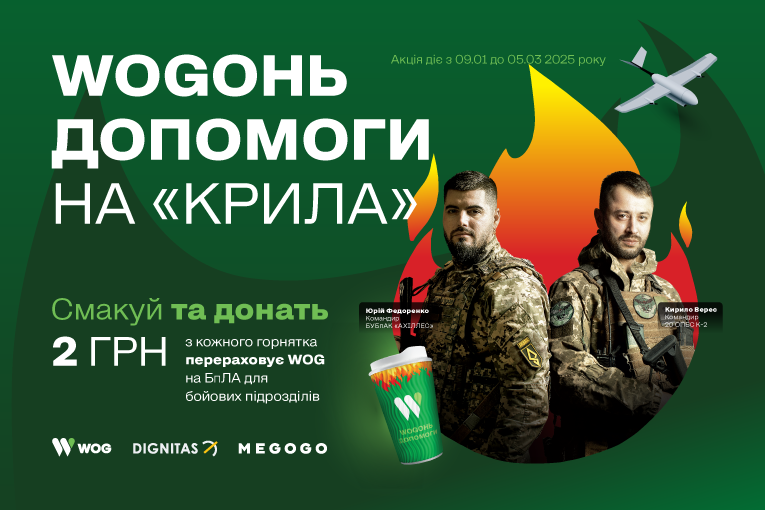 З 9 січня кожен, хто смакуватиме будь-яким гарячим напоєм на WOG автоматично долучається до проєкту «WOGОНЬ допомоги. На крила», а WOG перерахує 2 гривні з кожного горнятка на закупівлю БпЛА для батальйону ударних безпілотних авіаційних комплексів «Ахілесс» 92 ОШБр ім. кошового отамана Івана Сірка та 20 окремого полку безпілотних систем К2.