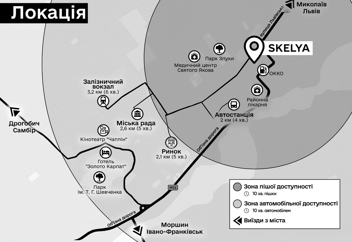 Щодо локації, то тут комплекс зосереджує на собі відразу декілька різних напрямків трафіку. ТРЦ Skelya буде розташований на вул. Львівській, 146, що знаходиться на в’їзді до міста зі сторони Львова та добре проглядається з двох напрямків: як з дороги до центру Стрия, так і з об’їзної, що підсилить його видимість і забезпечить стабільний трафік. Щодня цей напрям перетинають понад 6000 авто, що автоматично створює природний трафік. До цього додається пішохідний потік із прилеглих житлових кварталів та зручна транспортна розв’язка. ТРЦ матиме продуману інфраструктуру: просторий паркінг на 300 авто, велодоріжки та зони відпочинку, що формуватимуть зручне середовище для тривалого перебування. Простір продуманий саме так, щоб відвідувачі залишалися тут надовго – на обід, у кіно, з дітьми в ігровій зоні, і тим самим збільшували цінність кожного метра для бізнесу.
