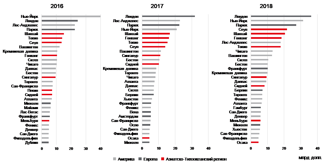Домінуюче становище на інвестиційному ринку продовжують займати найбільші міста світу, що характеризуються високою концентрацією капіталу, компаній та кваліфікованих фахівців. 30% глобальних угод проходять лише в 12 містах: Лондон, Нью-Йорк, Париж, Сеул, Гонконг, Токіо, Шанхай, Вашингтон, Сідней, Сінгапур, Торонто і Мюнхен – всі ці центри протягом останнього десятиліття стабільно входять в число найбільш затребуваних.