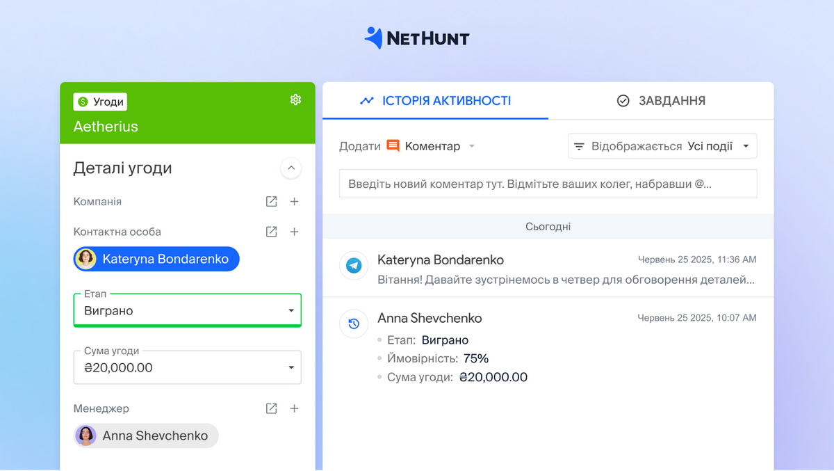 Звісно, відстежувати все це в Excel-таблицях — шлях до головного болю та помилок. Головна перевага, яку отримали Zakaz.ua, — це те, що вся інформація про клієнтів, угоди та комунікації тепер зібрана в одному місці. Це і є NetHunt CRM.