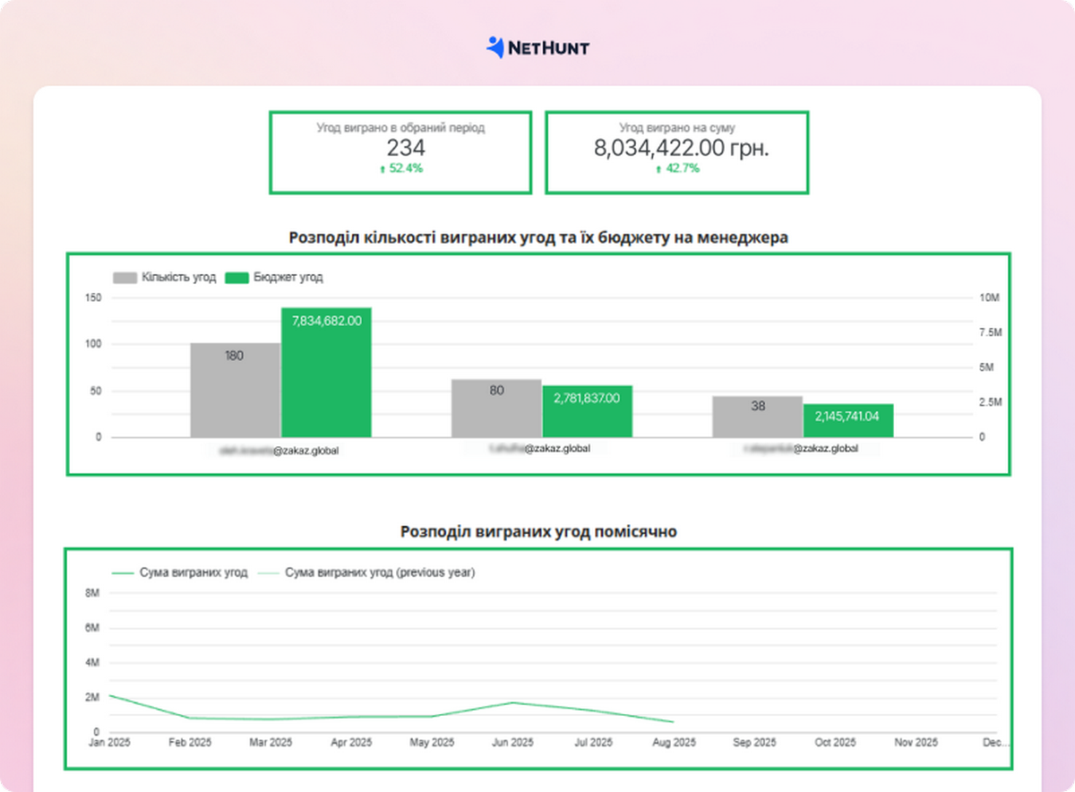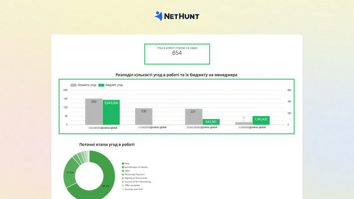 В NetHunt CRM команда Zakaz.ua бачить, чи генерує команда достатньо якісних угод з брендами і чи не витрачається час на безперспективні контакти. Система фіксує нові угоди та дії менеджерів. Керівник у звіті бачить реальну картину, а не просто загальну цифру “нових лідів”.