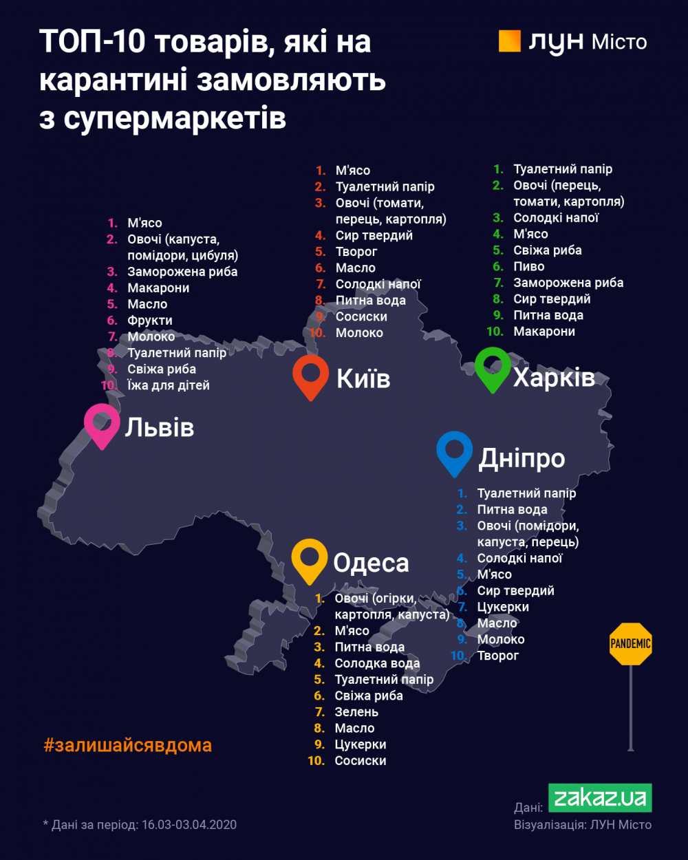 Такі дані наводить портал Delo.ua, з посиланням на результати аналізу онлайн-кошиків, який ЛУН Місто провів з сервісом доставки продуктів з супермаркетів Zakaz.ua. Аналізувалися замовлення Києва, Дніпра, Львова, Одеси і Харкова за перші три тижні карантину – від 16 березня до 4 квітня.