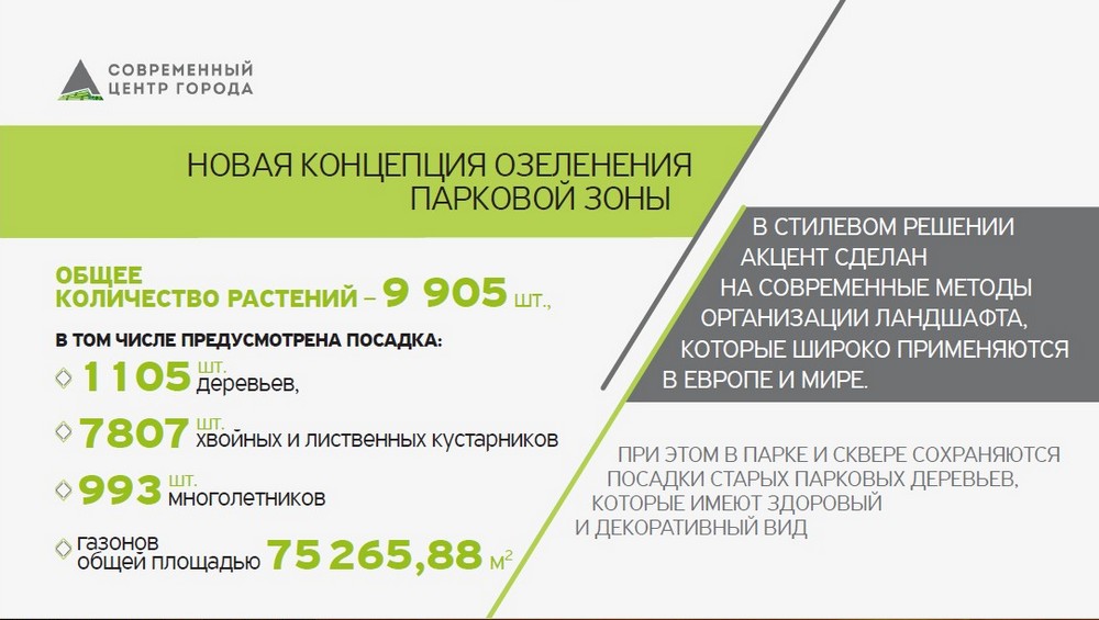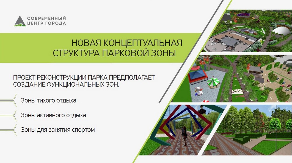 Автор проекту реконструкції, директор компанії Ді-Лайн і президент Гільдії ландшафтних архітекторів України Оксана Мілевська уточнила, що після реконструкції парк буде розбитий на три зони: для тихого і активного відпочинку, а також для занять спортом. Крім того, в парковій зоні буде створений унікальний спеціальний майданчик для скейтбордистів, що дасть можливість приймати змагання міжнародного рівня. «У стильовому рішенні проекту реконструкції парку ми зробили акцент на сучасні методи організації ландшафту, які широко застосовуються в Європі і світі. Всього планується висадити близько 10 000 рослин, що в п’ять разів більше ніж є зараз. Рослини, передбачувані до посадки, вирощені в кращих розсадниках Бельгії, Польщі, Німеччини та України. Особливий акцент зроблений на їх підборі – враховувалася кліматична і екологічна специфіка Запоріжжя», – підкреслила Оксана Мілевська.