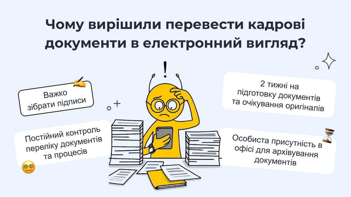 Тому аби не губити документи, не нагромаджувати їх та не витрачати купу часу на паперову роботу, рік тому в компанії перейшли на роботу з електронними кадровими документами.