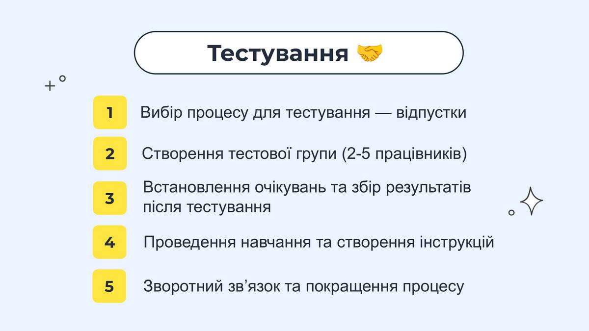 Почали з відпусток, і хоча це найоб'ємніший процес, але він зустрічається найчастіше. Спочатку доробили все, що було потрібно. Потім створили тестову групу з працівників з різних регіонів, які були зацікавлені в цьому проєкті. Зібрали відповідно зворотній зв'язок і знову вдосконалили технічну частину. Після чого провели навчання для персоналу та створили відповідні інструкції.