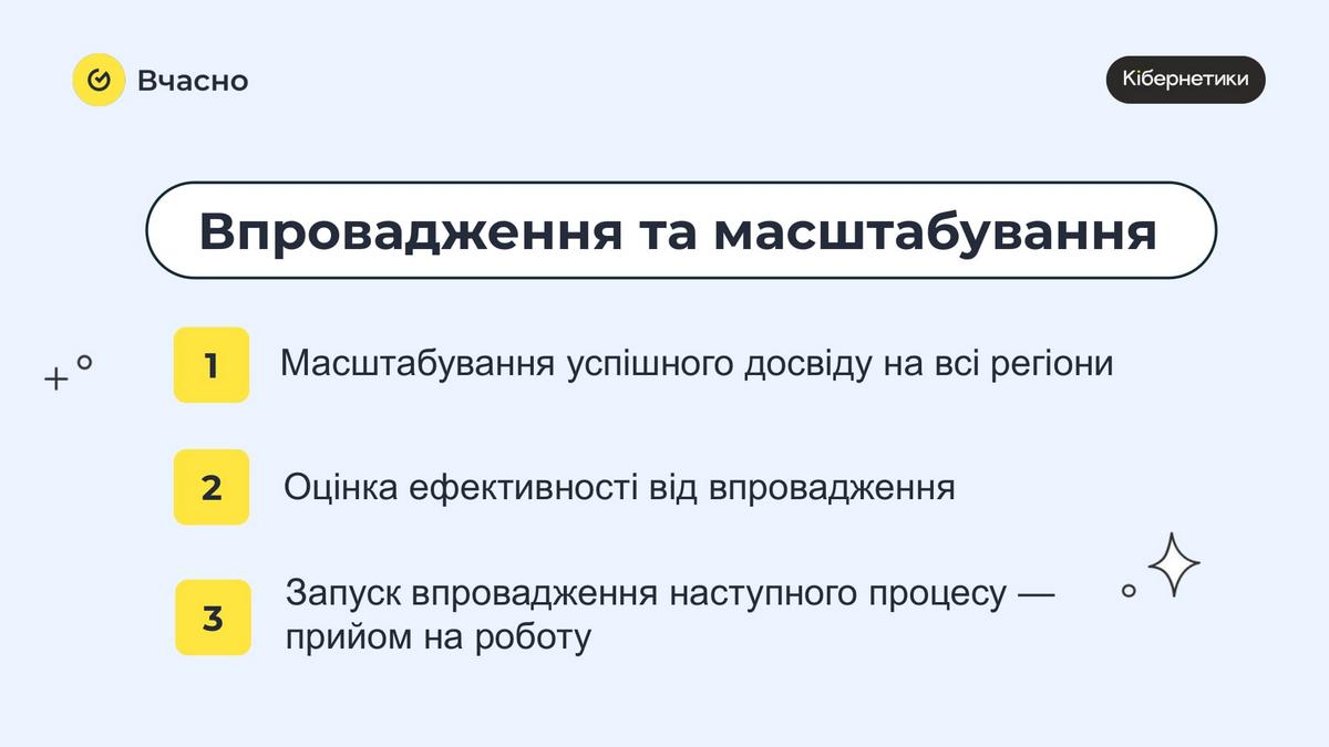 Останній етап – це вже масштабування електронного кадрового документообігу. Якщо автоматизація відпусток запускалася декілька місяців, то вже наступні процеси запустили за місяць. Коли вже всі учасники розуміли, як це працює на практиці. На черзі – впровадження абсолютно нового модуля «Вчасно.Кадри». Він дозволяє відразу весь пакет документів співробітника «затягувати» в особову карту в обліковій системі і на основі цих даних створювати весь пакет документів для прийому на роботу. В середньому це звільняє для інспектора 30-40 хвилин часу на одному оформленні. Окрім економії часу (509 годин) мережа Кібернетики за рік роботи з ЕДО заощадила на поштових послугах, папері, заправці принтерів тощо 700 000 грн.