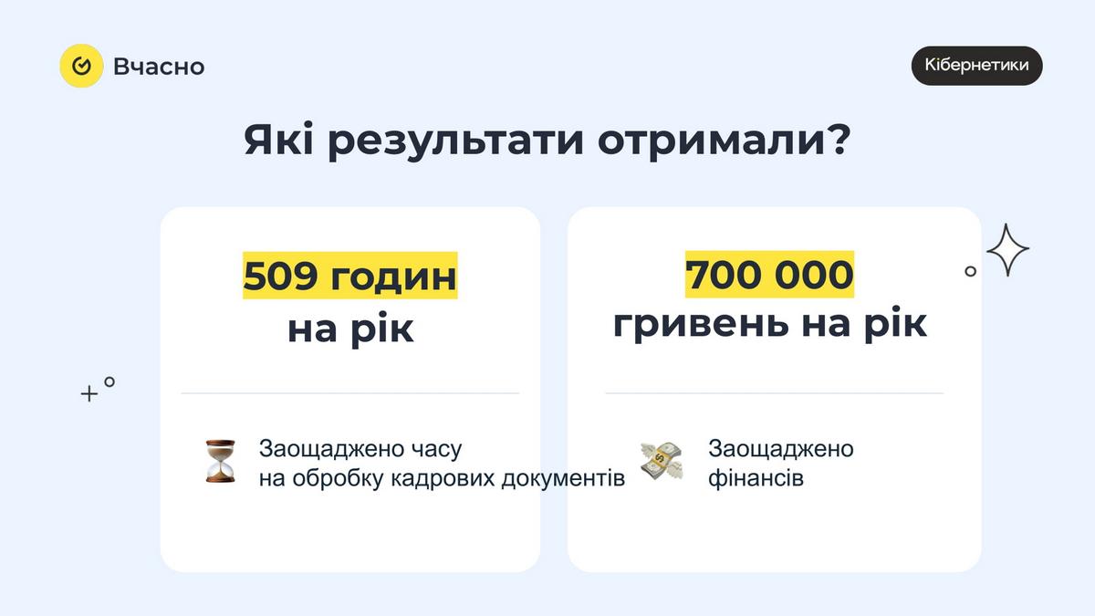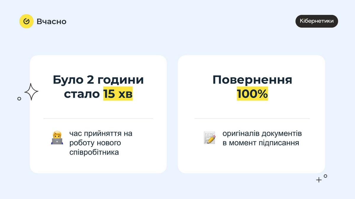 Як зазначають в сервісі Вчасно, різні інспектори з кадрів із багатьох компаній завжди кажуть одне: «Ми хочемо економити час робітнику, керівнику, директору, собі». І завдяки автоматизації дійсно економлять свій робочий час – інколи до 30-40%. Так, в мережі Кібернетики працює 300 власних фахівців, які мають знання і досвід в продажах саме техніки. Завдяки звільненню від необхідності оформлювати паперові документи вони можуть зосередити всю свою увагу саме на покупцях.