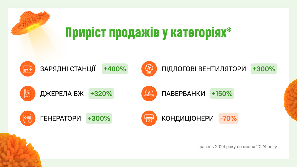 У 2024 році вентилятори купують більше, ніж у попередні роки та до повномасштабного вторгнення. В категорії «кондиціонери» з початку повномасштабної війни попит впав приблизно на 70%. За останні два тижні, через спеку, попит на кондиціонери зріс, але він досі далекий від довоєнного. Перш за все, через внутрішню міграцію, відтермінування дорогих покупок і необхідність економити споживання електроенергії.