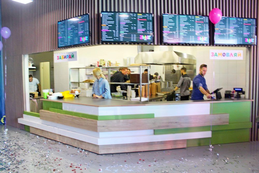 Відразу за ресепшеном розташована точка фаст-фуд, де діти та дорослі можуть перекусити й відпочити. Меню досить велике: є і бургери, і салати, і супи, і страви здорового харчування. Працює точка в колаборації з відомим ресторатором Дмитром Заходякіним, засновником мережі ресторанів THE (The Burger, The Coffee і т.д.). Всі інгредієнти в дитячий центр поставляє він, і відповідає за приготування та якість страв.