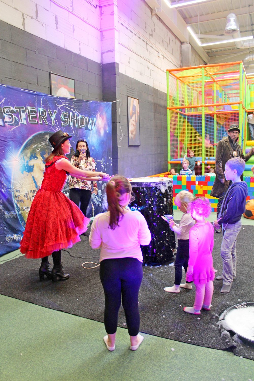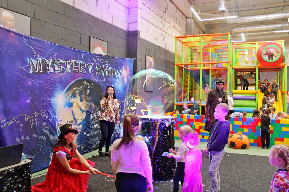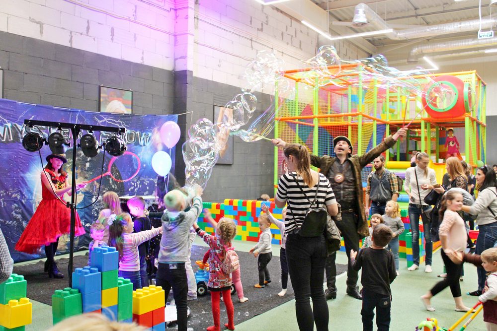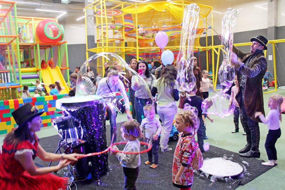 А на першому поверсі для дітей влаштували шикарне шоу мильних бульбашок. Найменших навіть вдавалося повністю приховати за прозорою плівкою. Само собою, в охочих випробувати настільки незвичайні відчуття нестачі не було.