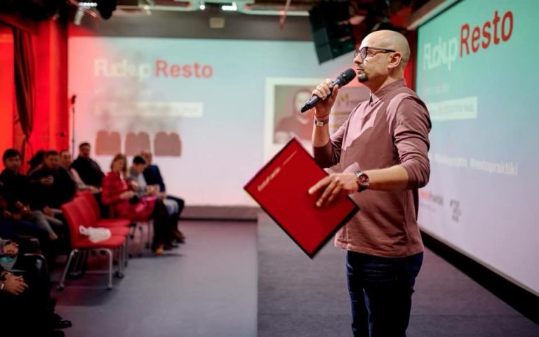 Повернувшись, він провів перші «РестоПрактіки» в столичному готелі Космополіт, де зібрав топових українських і російських рестораторів, в тому числі Сергія Гусовського й Арама Мнацаканова. Всього 12 спікерів і близько 70 учасників.