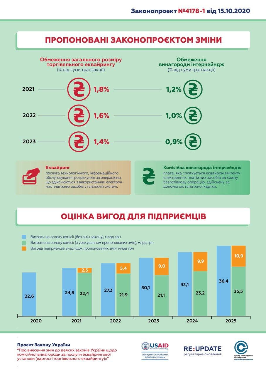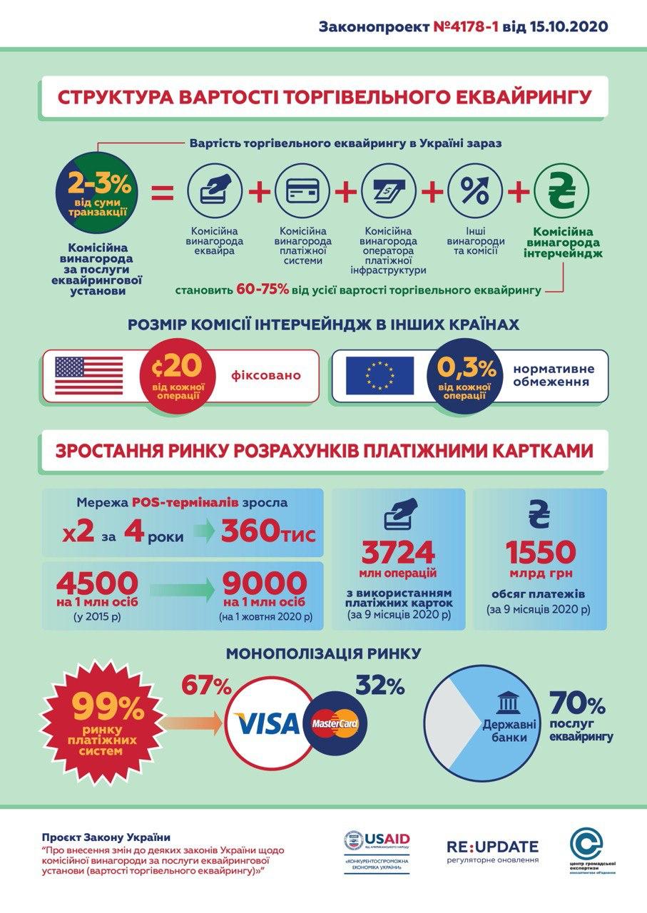 У Європейському Союзі плата за безготівковий розрахунок становить не більше 0,3% і обмежена директивою ЄС № 17-751. Незважаючи на те, що ЄС захищають конкуренцію як базову цінність своєї економіки, вони жорстко вдалися до регулювання цього тарифу – чим практично показали, що ця сфера не належить до тих, які здатен регулювати ринок. В Україні 70% послуг еквайрингу надають державні банки, а 99% ринку платіжних систем – 2 гравці. Вони фактично мають законодавчий дозвіл на монополію у сфері еквайрингу, що підвищує ціну товарів та послуг для споживача, скорочує їхні і без того невеликі доходи (Україна є країною з найменшим доходом на душу населення у Європі), обмежує купівельну спроможність українців, погіршує їх фінансове становище в умовах кризи COVID-19.