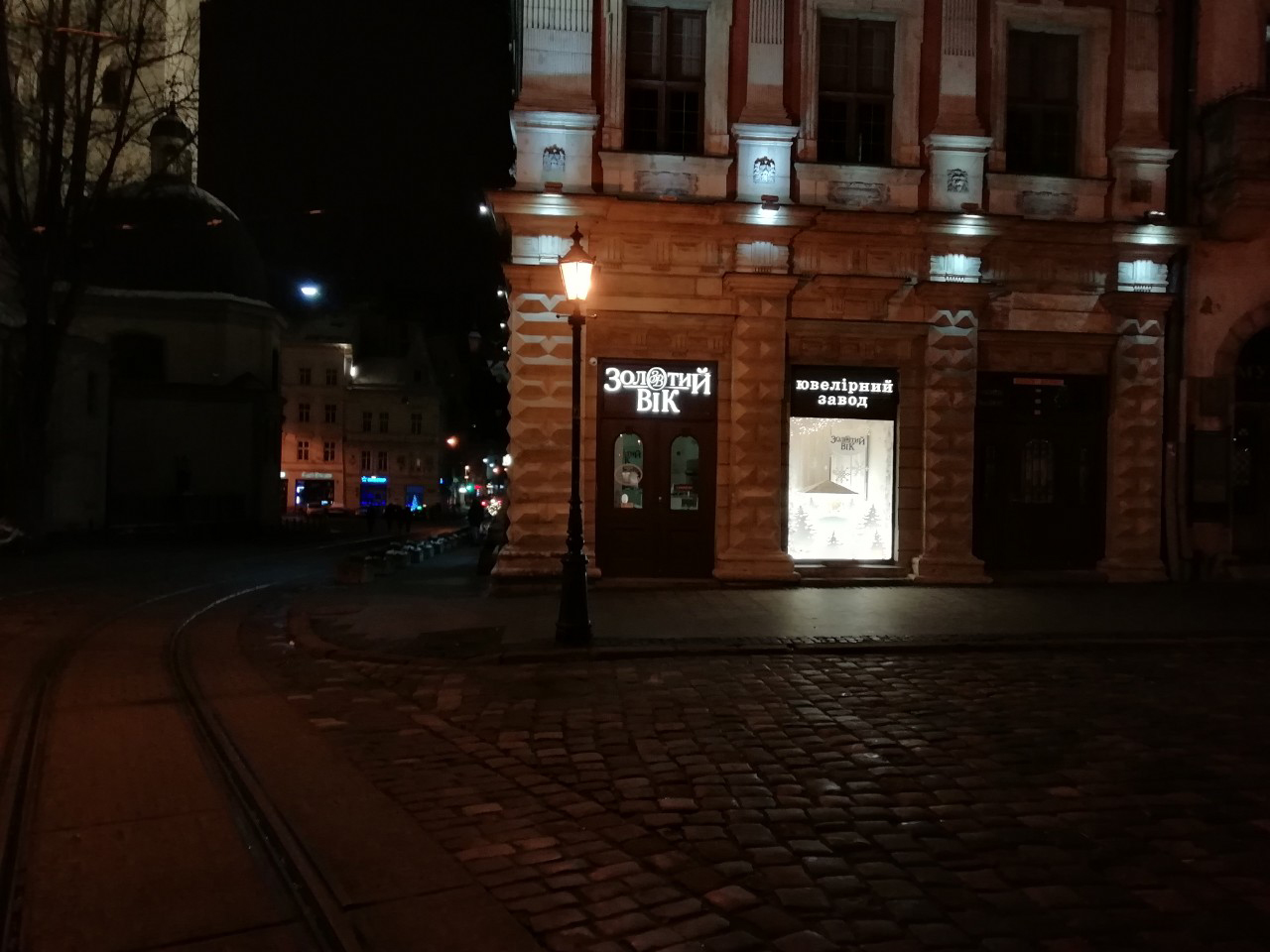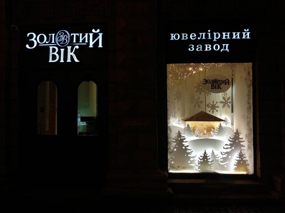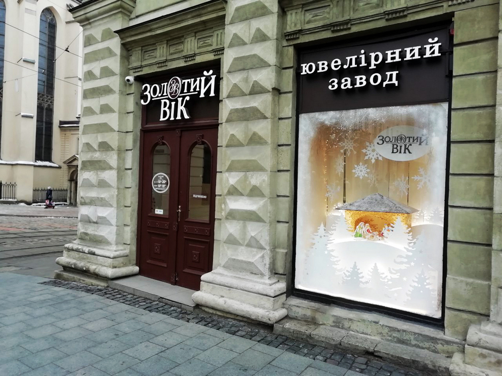 По-святковому оформлена вітрина ювелірного магазину вже тішить красою перехожих на пл. Катедральна, 3. Прикрашає одне з вікон львівського магазину шопка – вертепна скриня, що зображає віфлеємську стайню в ніч Різдва Христового. Святкового настрою композиції надають додаткові елементи – «ліс» із білих ялинок, сніжинки з різноманітними візерунками та блискучі гірлянди.