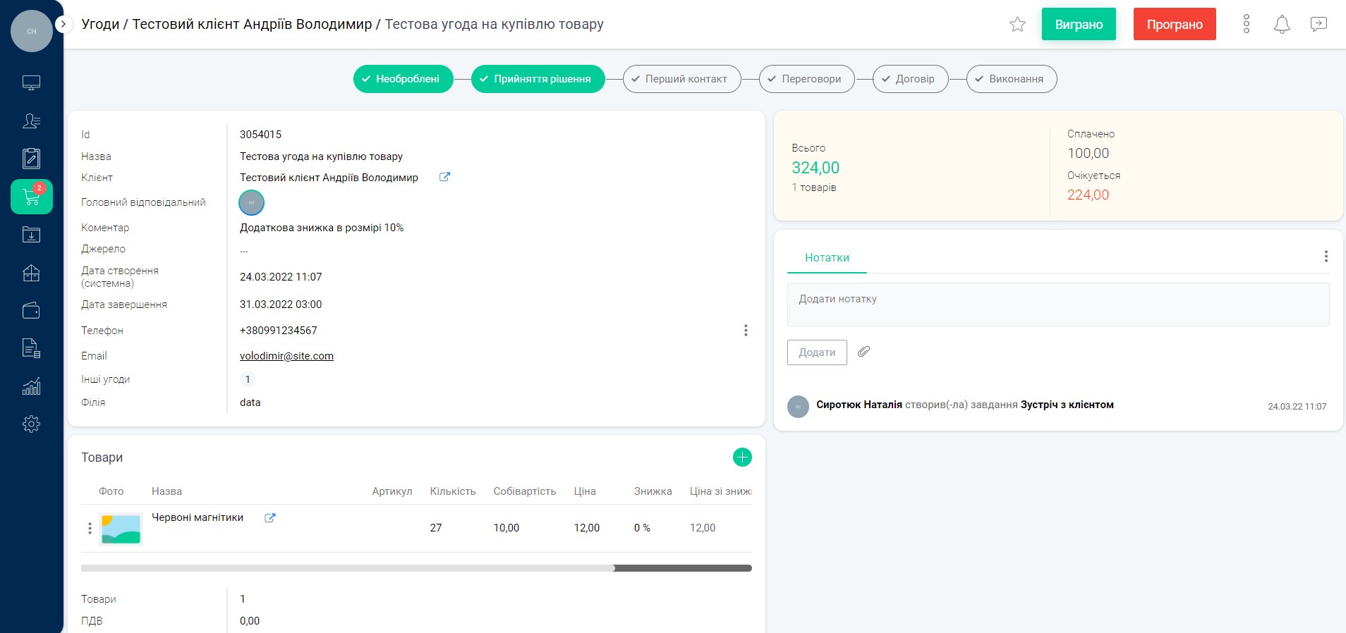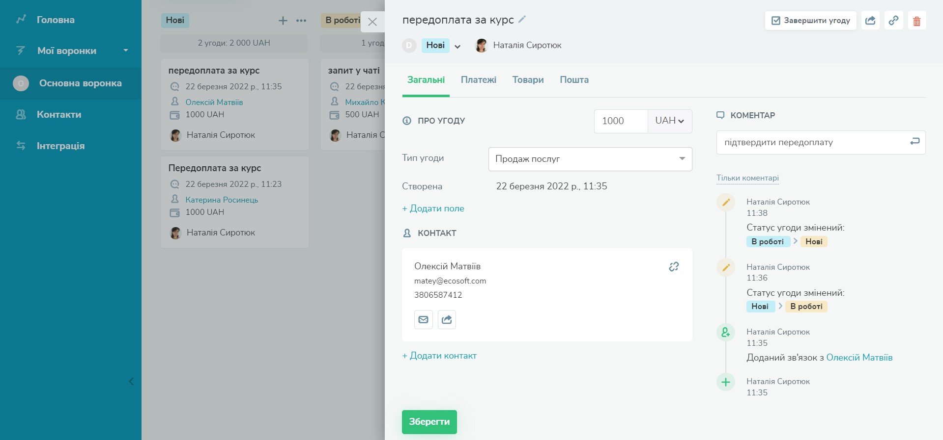 Система дозволяє створювати та редагувати угоди вручну або автоматично, а також надавати їм статус, наприклад, «Чекає оплати», «Оплачено» та інші. Ви можете створити команду для спільної роботи над угодами і призначити відповідну роль кожному учаснику.