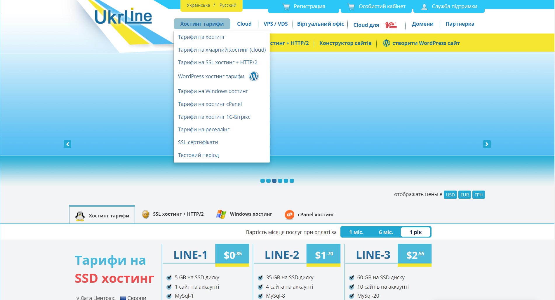 Сервери UkrLine розташовані в Україні, США, Європі. Мінімальний тариф для сайту на WordPress — від 54 грн на місяць, 35 ГБ на SSD-диску для двох сайтів. Безкоштовний SSL-сертифікат та drag&drop-конструктор сайтів. Безкоштовний регіональний домен .ua при оплаті на рік.