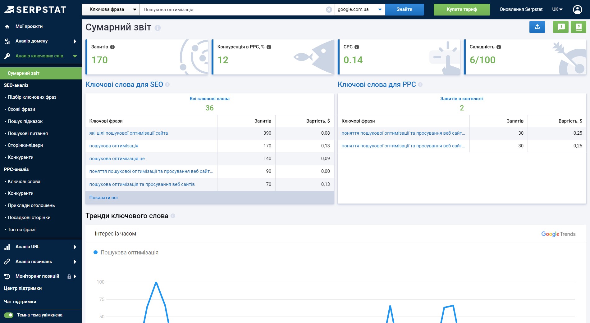 Звіт у Serpstat за запитом «Пошукова оптимізація»