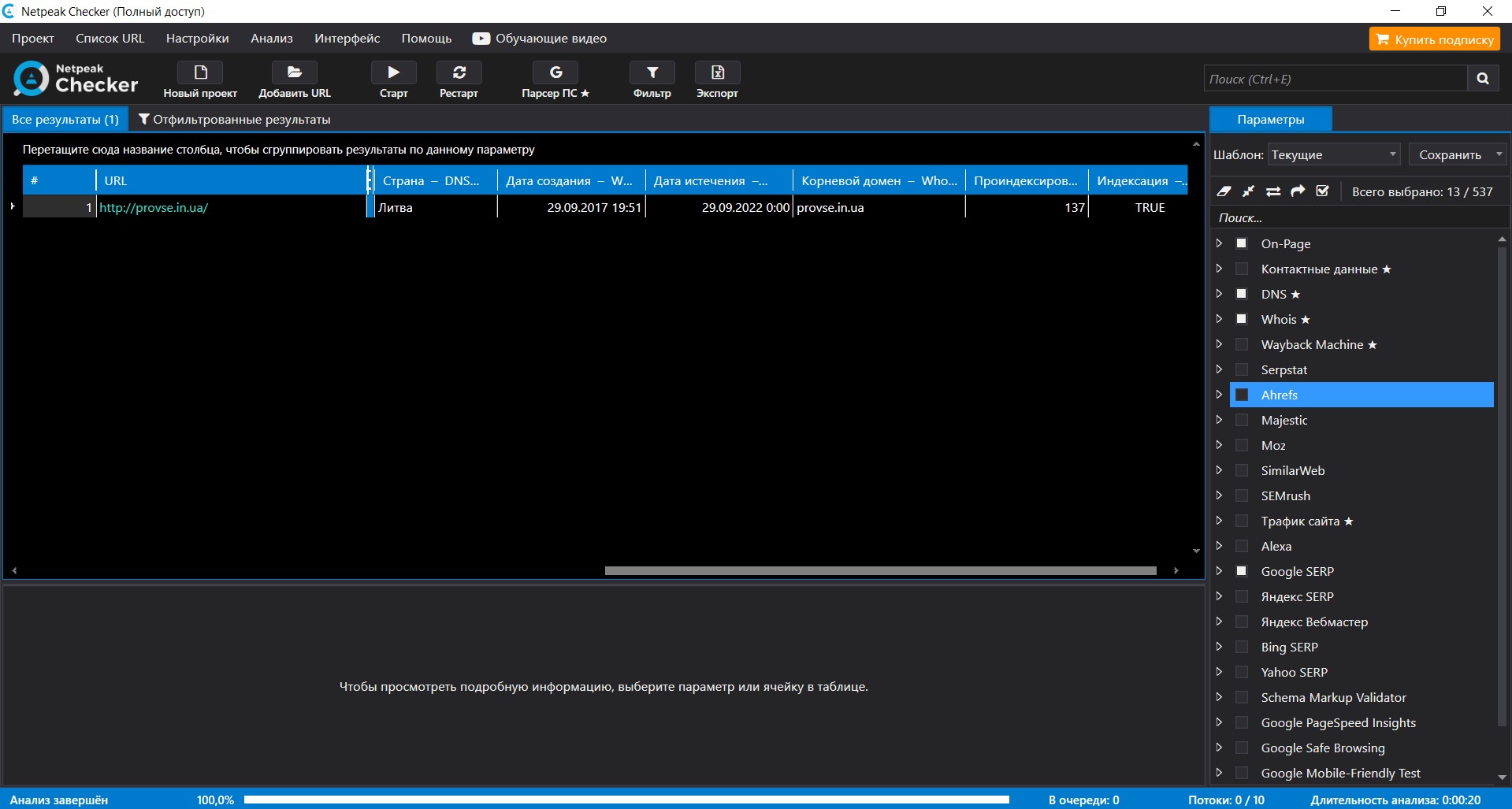 Netpeak Checker — програма, яка збирає результати видачі пошукових систем та параметри з SEO-сервісів: Ahrefs, Semrush, Serpstat, Moz, Facebook, Google, Yahoo! для детального аналізу конкурентів або цілої ніші.