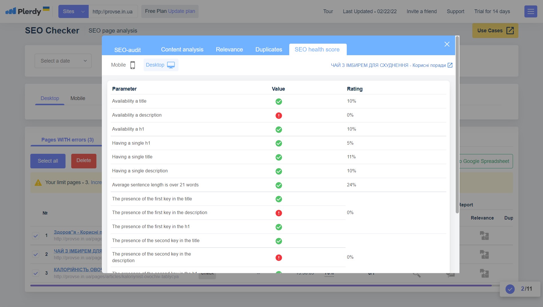SEO-аудит сторінки сайту в сервісі Plerdy