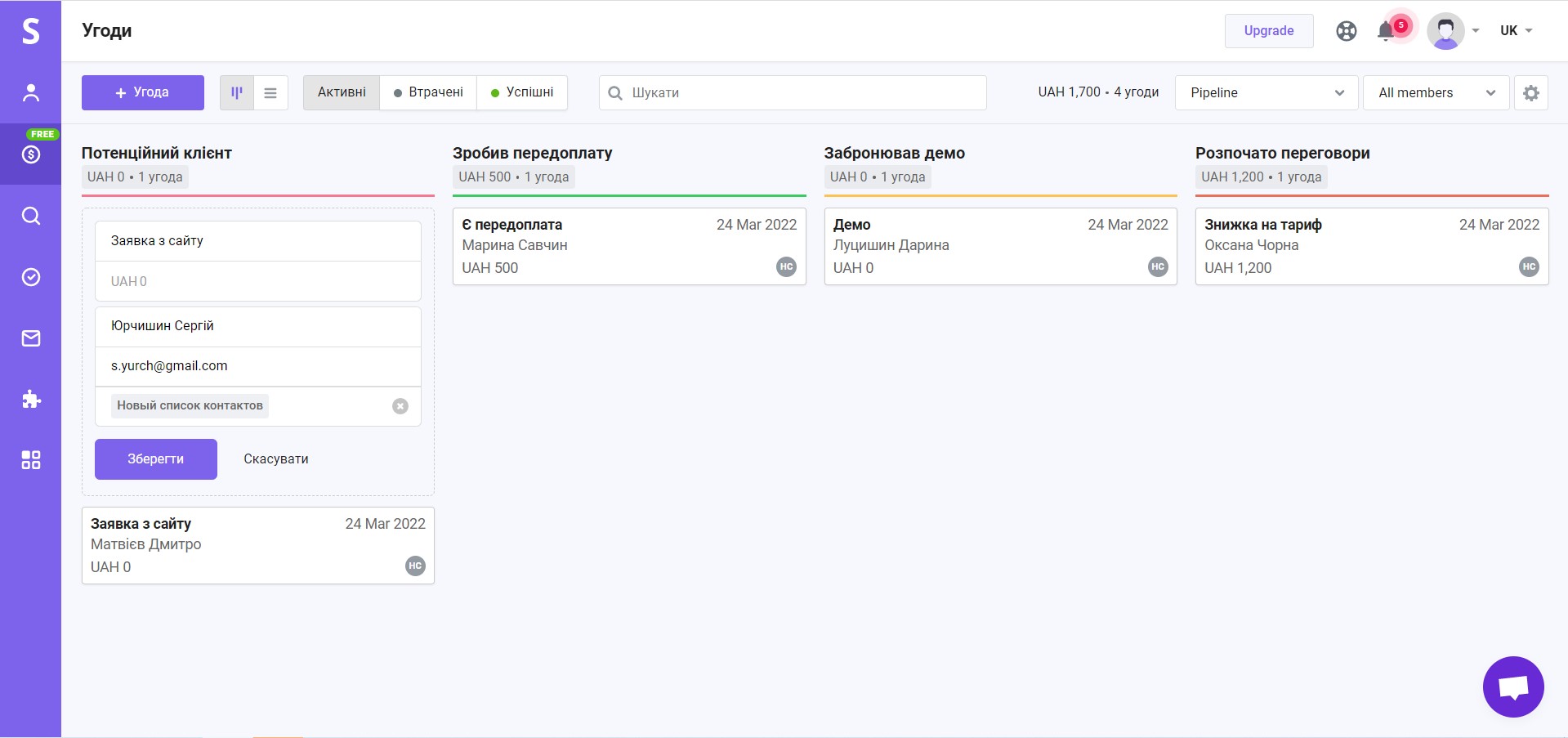 Безкоштовна CRM-система для малого, середнього та великого бізнесу. Snov.io CRM дозволяє працювати над угодами необмеженій кількості користувачів, а також пропонує інтегрований сервіс email-розсилок — пошук email-адрес потенційних клієнтів, верифікацію пошти, сегментацію списків і тригерні авторозсилки.