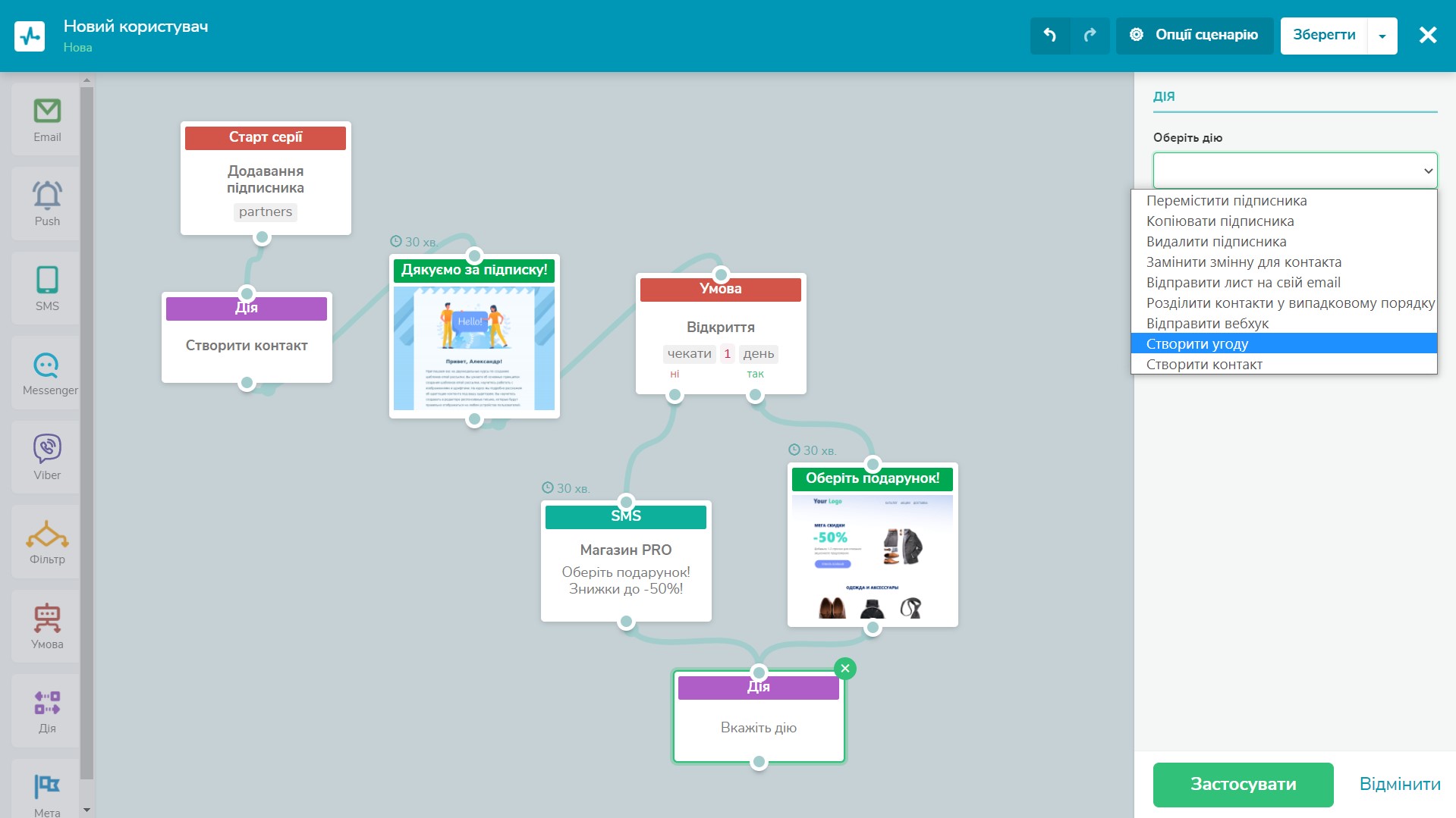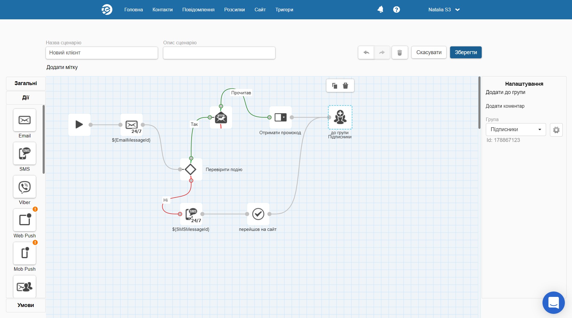 Омніканальна платформа, яка дозволяє створювати форми підписки на сайті для збору email-адрес користувачів, пропонує зручний конструктор електронних листів, налаштування транзакційних повідомлень у відповідь на цільові дії користувача, а також автоматичні ланцюжки тригерних розсилок. Ви також можете безкоштовно створити у сервісі чат-бота та додати чат-бот повідомлення у сценарій авторозсилки.