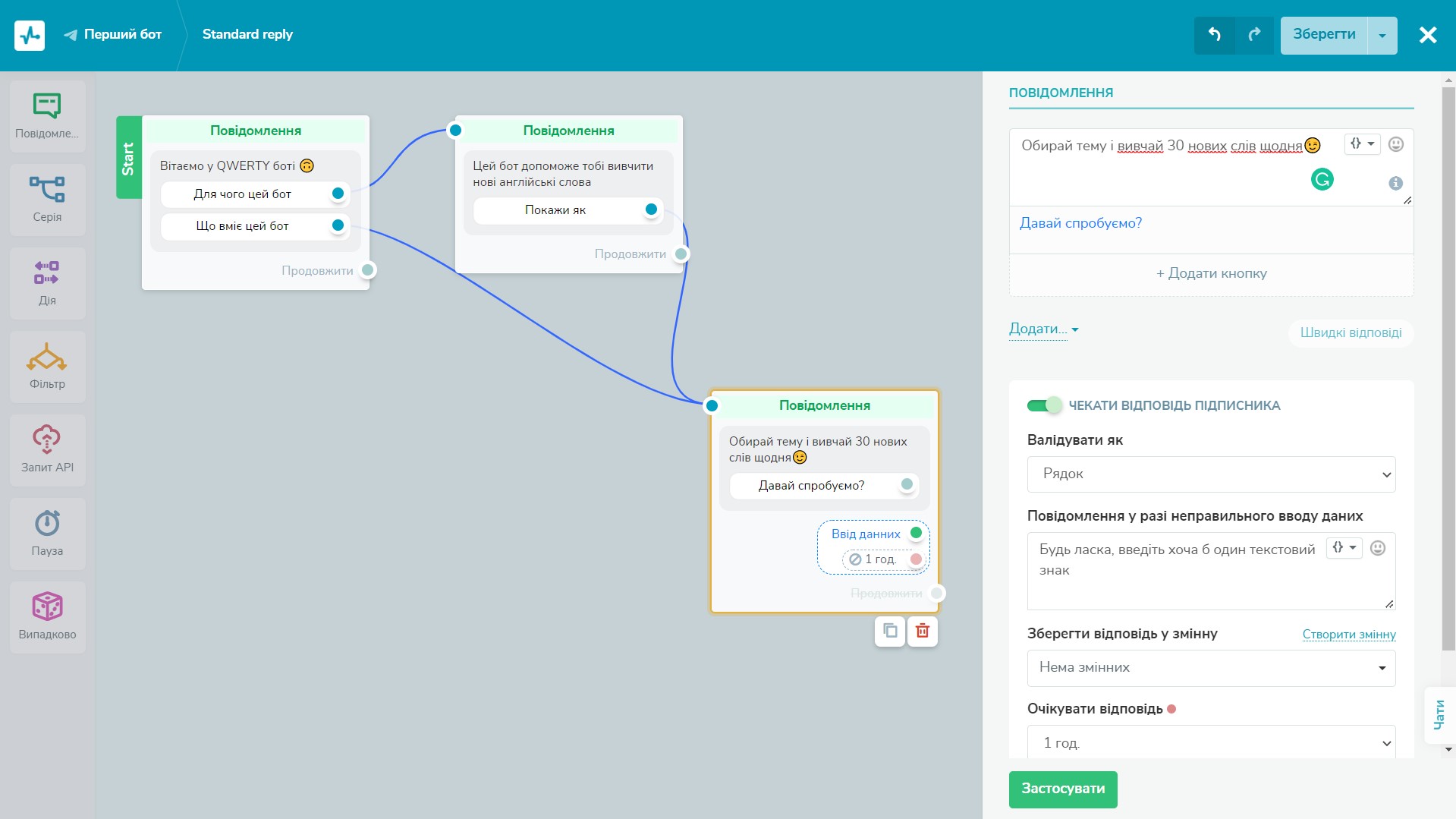 Activechat поєднує у собі чат-бот зі штучним інтелектом та онлайн-чат. Коли клієнт надсилає повідомлення, його аналізує бот та порівнює повідомлення з існуючими сценаріями. Якщо знаходить збіг, то відповідає користувачу, якщо ні, підключає до діалогу менеджера. Бот аналізує розмову з клієнтом у реальному часі, запам’ятовує його фрази та навчається. Додайте до словника фрази, які може використовувати ваш клієнт, щоб пришвидшити навчання чат-бота.