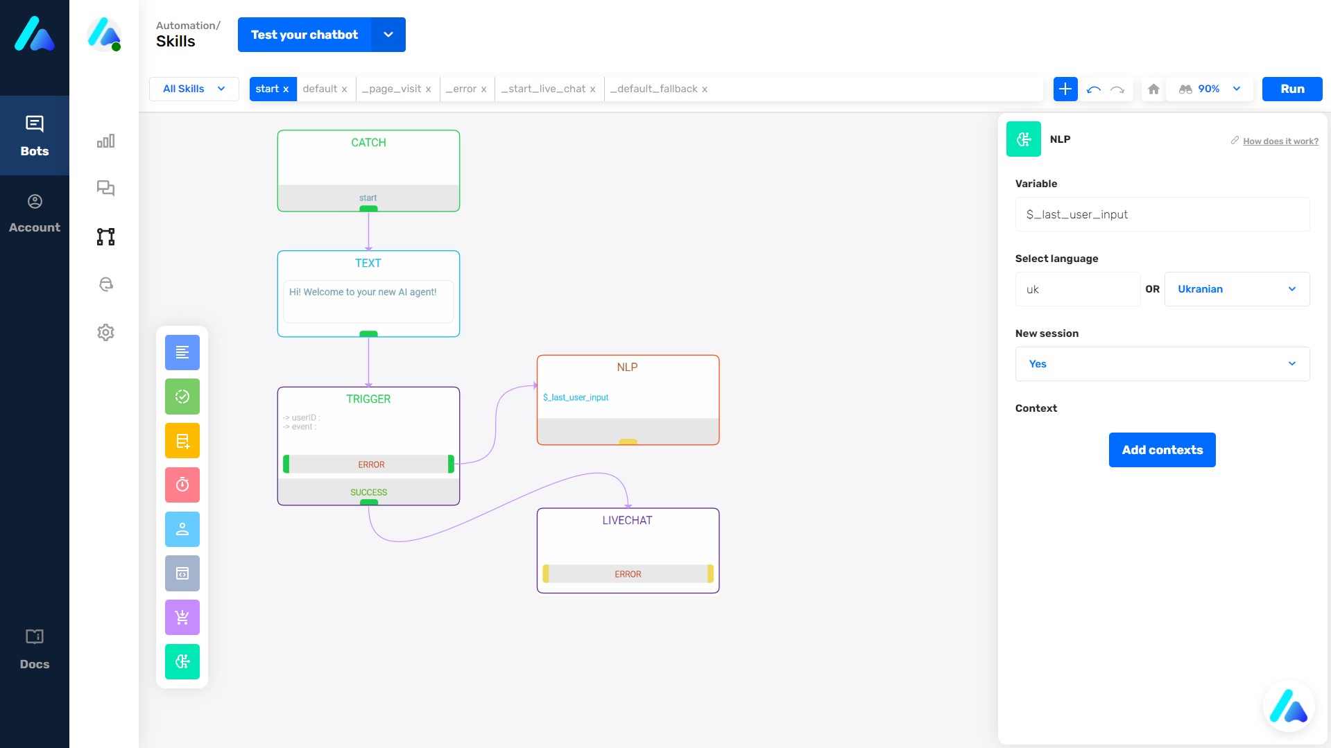 Ви можете підключити чат-бота до кількох каналів: чат на сайті, Facebook Messenger, Telegram, email або SMS. Вартість однієї розмови становить в середньому $0,001.
