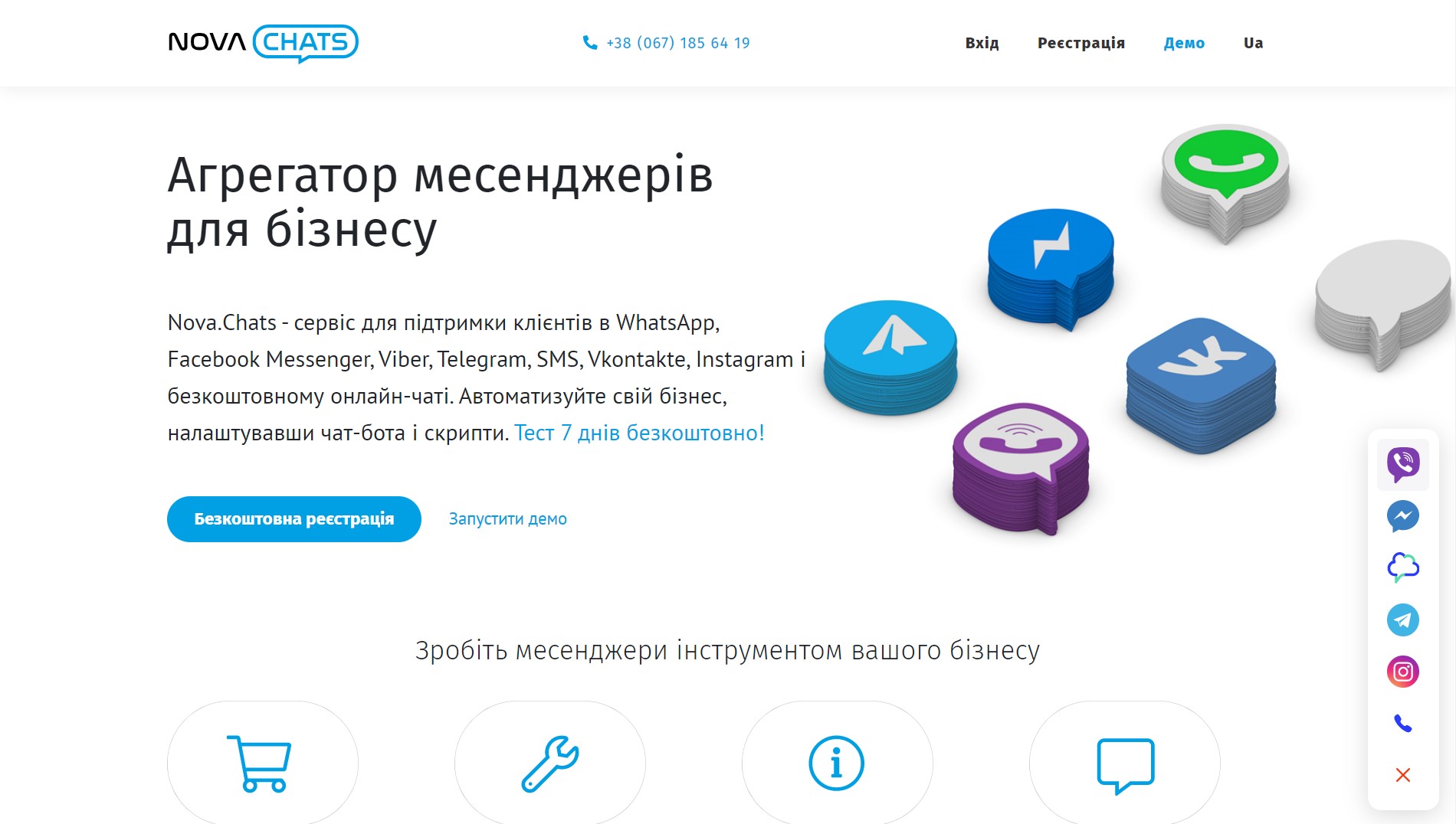 Nova.Chats пропонує безкоштовний онлайн-чат на сайті. Окрім того, сервіс агрегує повідомлення з WhatsApp, Facebook Messenger, Viber, Telegram, SMS, Instagram, Skype та email. Далі чат-бот або оператор опрацьовує повідомлення.