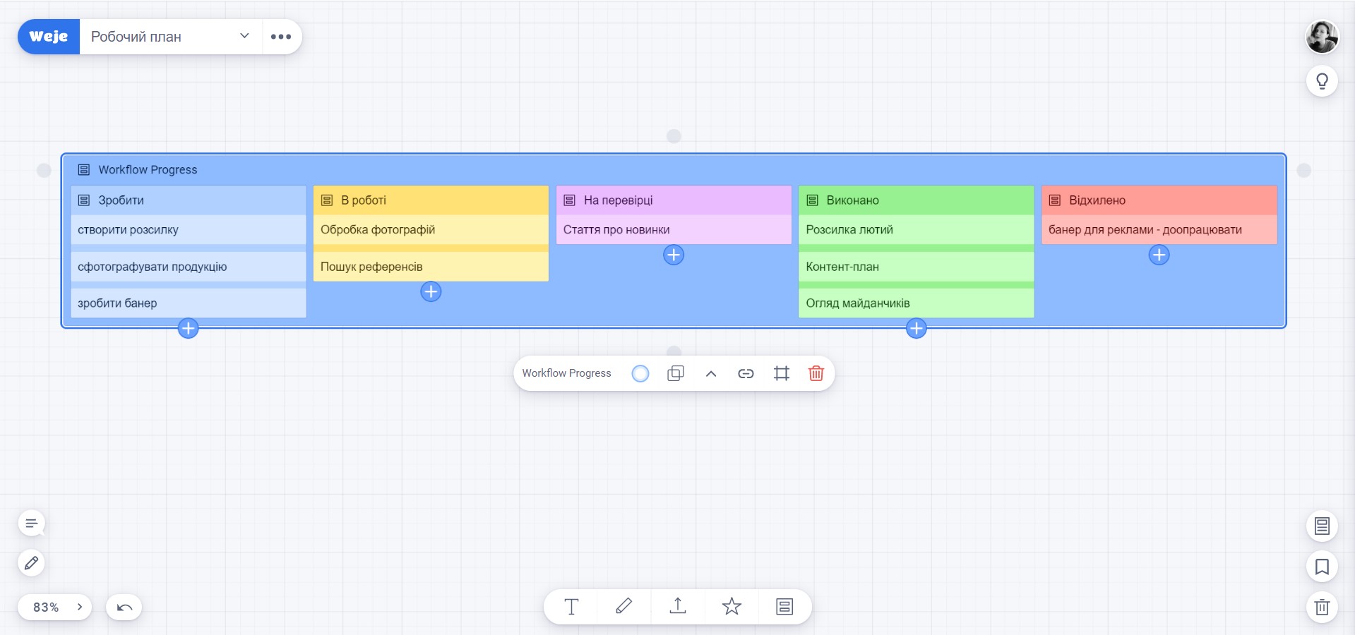 Щоб протестувати канбан-методологію безкоштовно, використайте сервіс Weje.io. Система дозволить відстежити і проаналізувати, які задачі виконуються довше і чому.