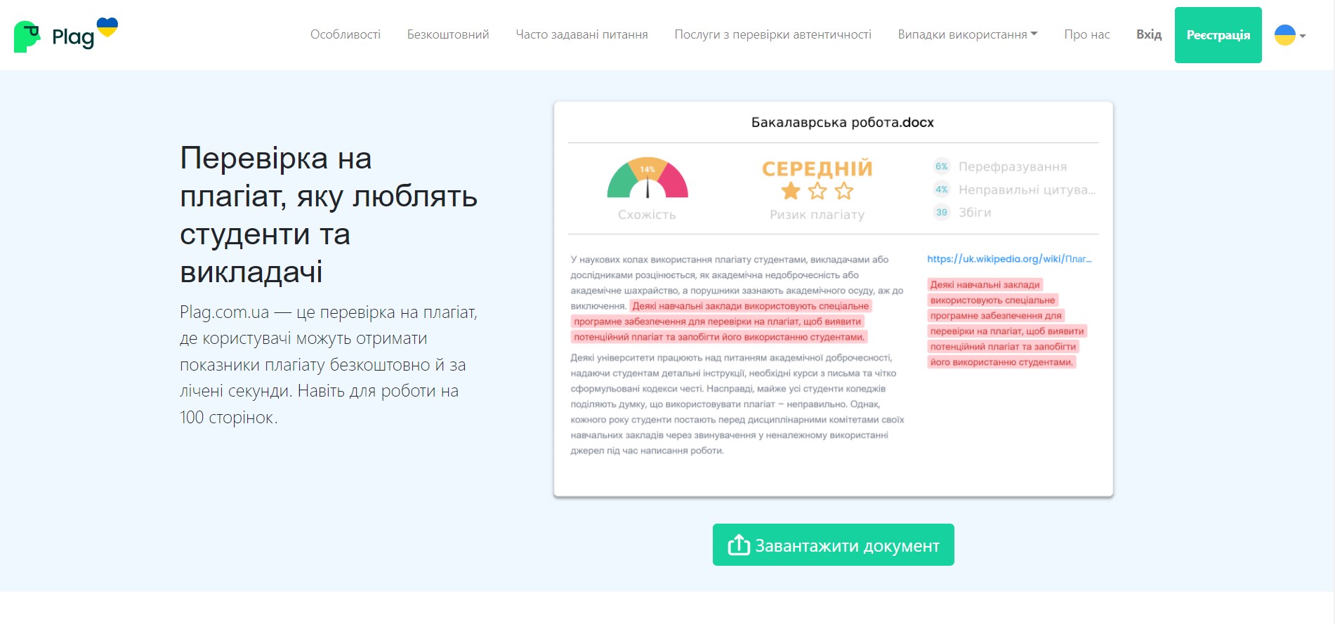Сервіс Plag перевіряє текст на плагіат, використовуючи найбільшу базу наукових статей та відкриту базу з 14 трильйонами вебсторінок, документів, книг і так далі, які можна знайти в інтернеті. Plag підтримує 129 мов та є безкоштовним для працівників освіти по всьому світу. Також сервіс пропонує обмежений функціонал безкоштовно для тих, хто не працює викладачем.