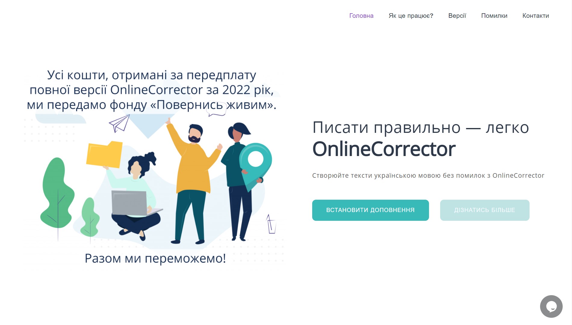 OnlineCorrector — доповнення для «Google Документів» або Microsoft Word, яке автоматично виправляє помилки в текстах українською мовою. Базова версія з перевіркою за обмеженою кількістю правил безкоштовна. Повна версія коштує від 199 грн на місяць. Усі кошти, отримані за передплату повної версії у 2022 році, сервіс перераховує у фонд «Повернись живим».