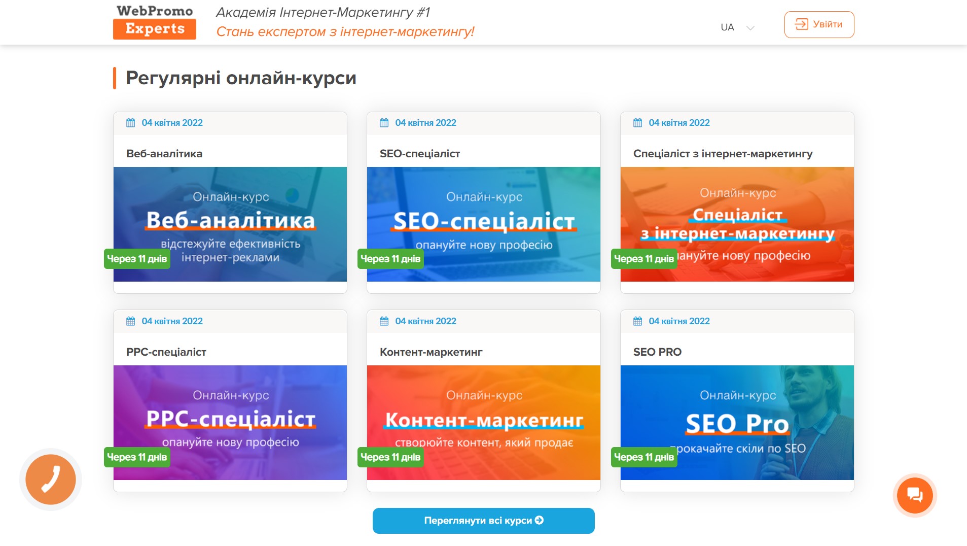 Академія WebPromoExperts пропонує регулярні онлайн-курси, семінари, корпоративне навчання та конференції для інтернет-маркетологів та підприємців. Зараз у WebPromoExperts діють знижки від 21 % до 68 % на онлайн-курси.