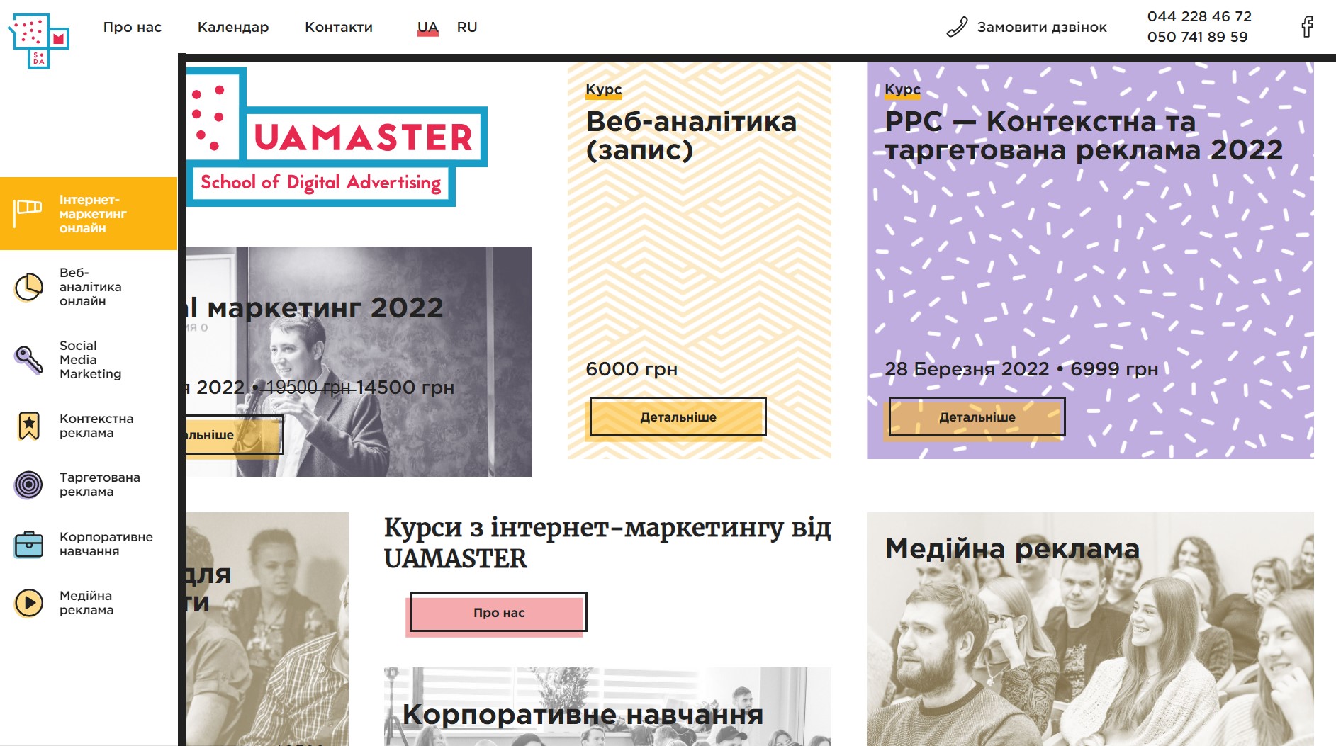 Школа цифрової реклами UAMASTER пропонує курси з цифрового маркетингу, вебаналітики, таргетованої, контекстної та медійної реклами, SMM, а також корпоративне навчання. Вартість курсів — від 5,6 тисяч грн.