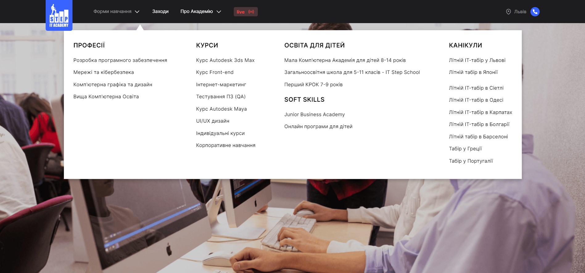 Українська комп’ютерна академія, заснована у 1999 році. IT Step Academy навчає майбутніх програмістів, дизайнерів і системних інженерів, має філії в Україні та ще 16 країнах, пропонує очне та онлайн-навчання та курси для дітей від семи років.