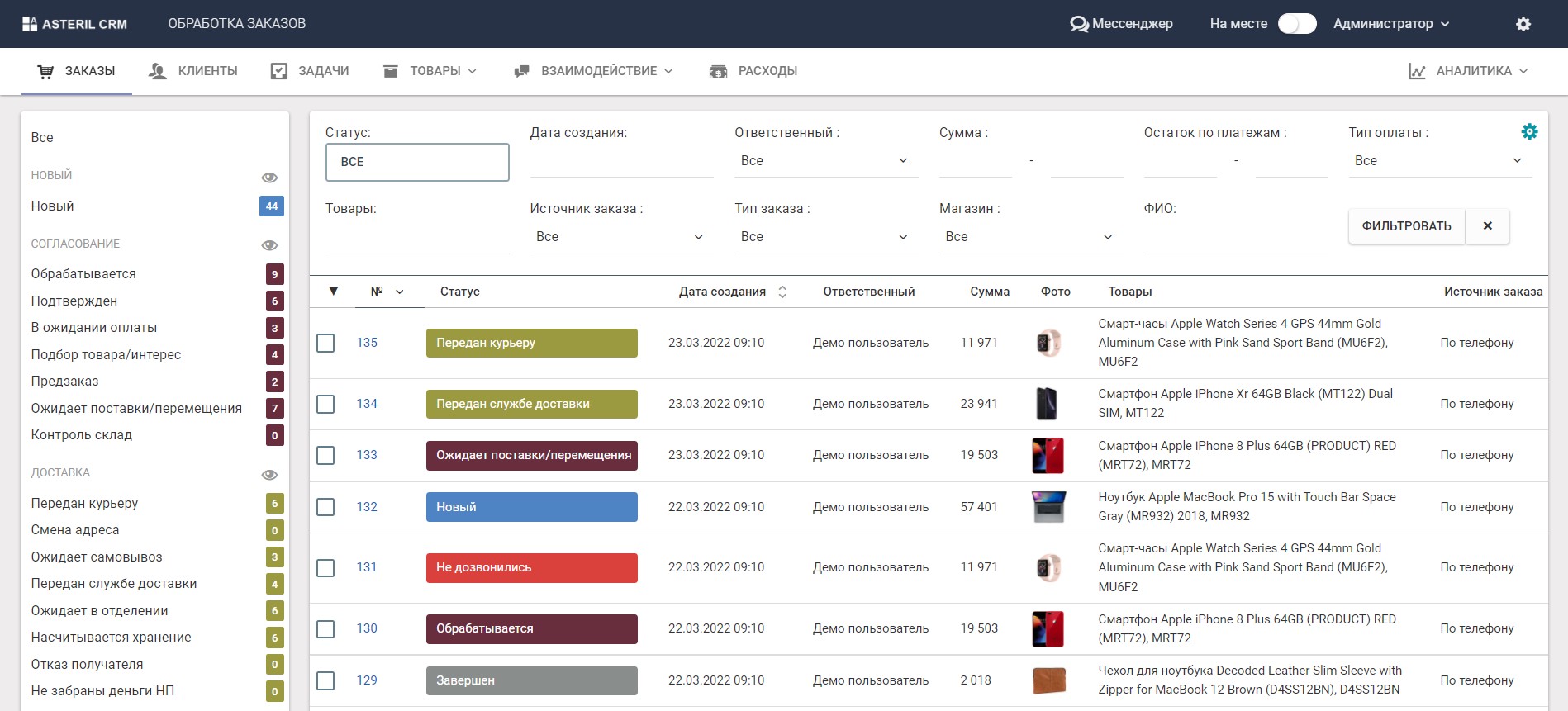 CRM-система для автоматизації інтернет-продажів. Asteril CRM має широкий пакет інтеграцій з маркетплейсами, CMS, службами доставки, банківськими сервісами, телефонією, месенджерами тощо.